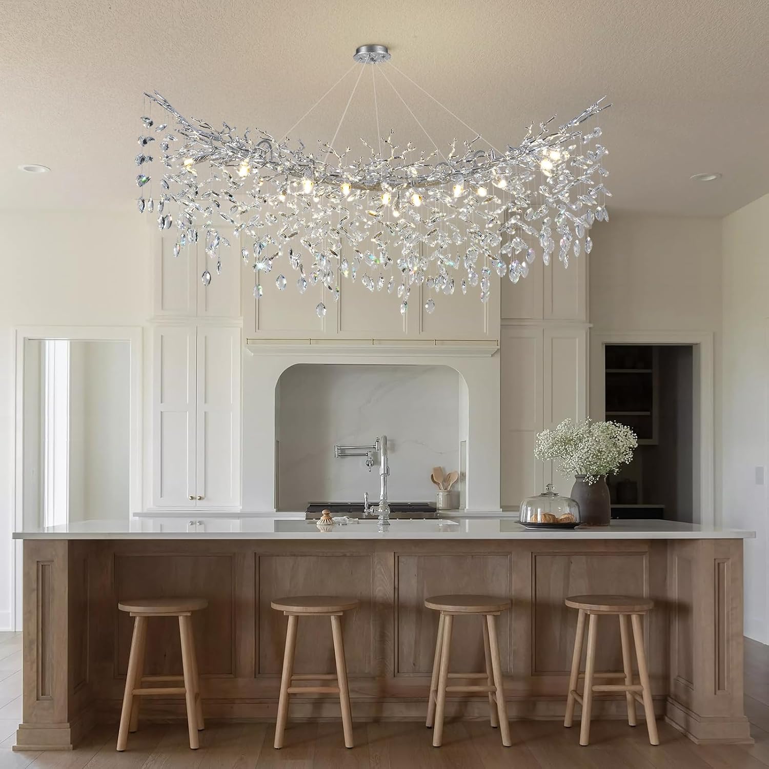 - Application Space:This Round Crystal Chandelier Is Like A Silver Tree, It Can Light And Warm The Whole House, And It Is Also A Great Decorative Light. The Ceiling Canopy Of The Chandelier Is Compatible With Both Flat And Sloped Ceiling Installations, So It'S Perfect For Dining Room, Living Room, Kitchen Island, Bedroom And Any Other Space.