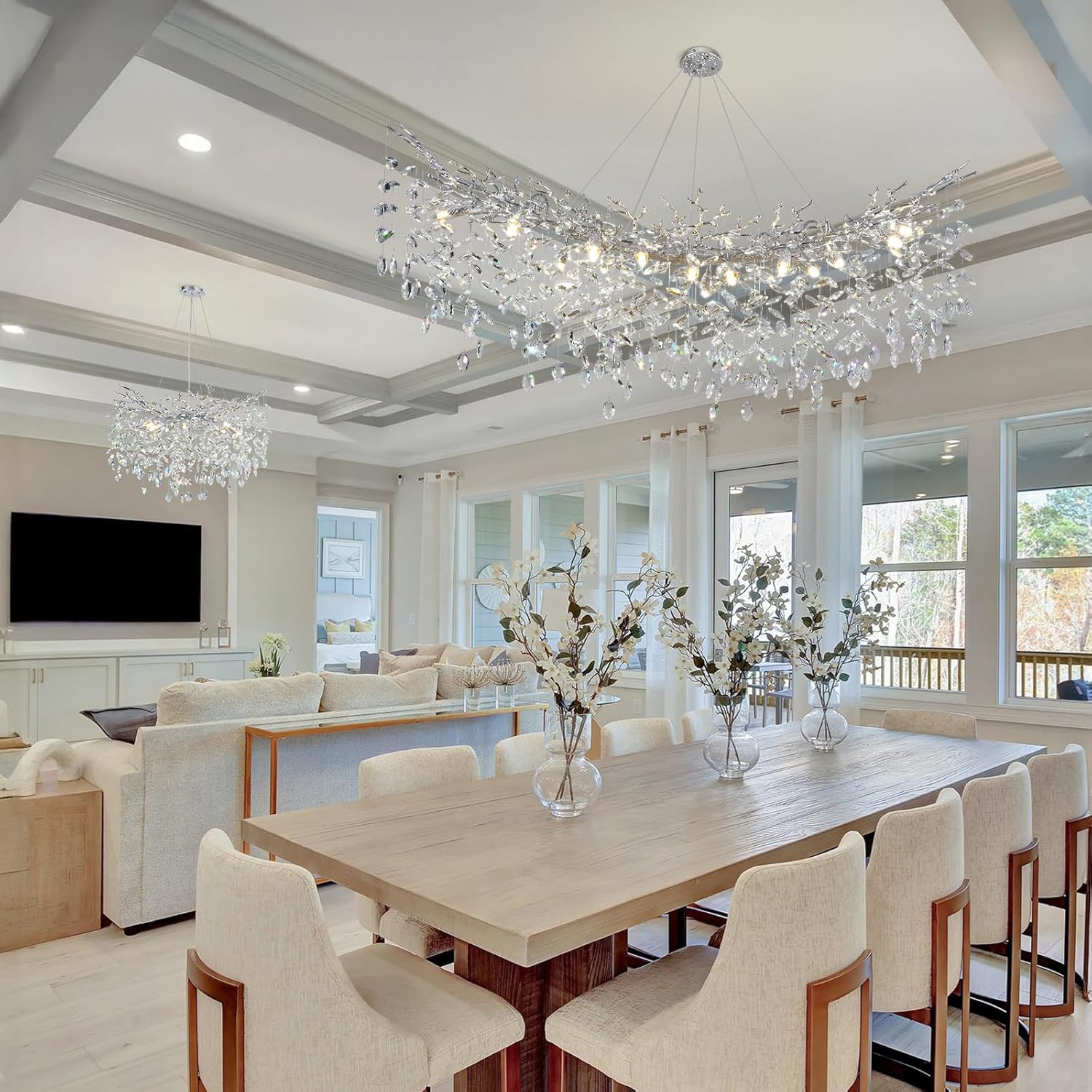- Modern Crystal Chandelier:Transform your living space into a captivating masterpiece with our Elegant Crystal Tree Branches Chandelier. This stunning chandelier is designed to impress, featuring a unique tree branch-inspired design adorned with glistening crystals that cast a mesmerizing play of light and shadow.