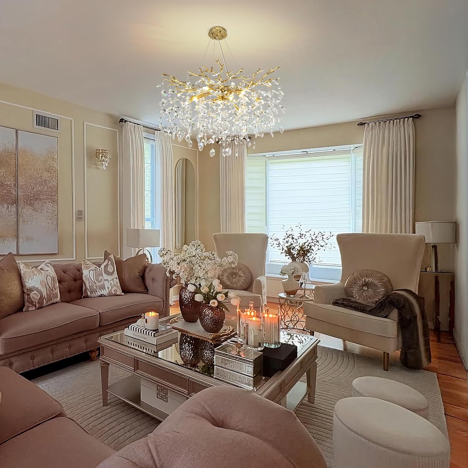 - Application Space: This round crystal chandelier for the dining room resembles a golden tree, illuminating and warming the entire house while also serving as a beautiful decorative light. The ceiling canopy of the chandelier is compatible with both flat and sloped ceiling installations. In addition, it is perfect for the living room, kitchen island, bedroom, foyer, bathroom,high ceiling space, and any other space.