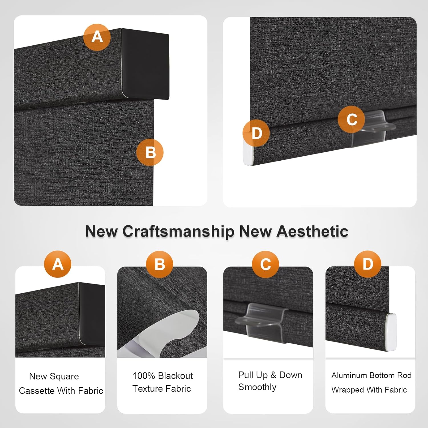 Persilux Free-Stop Cordless Blinds for Indoor Windows with Cover, Window Shades Blackout Roller Blinds, Thermal Insulated Fabric UV Protection for Kitchen, Office, Living Room, Black(29.5" W x 64" H)
