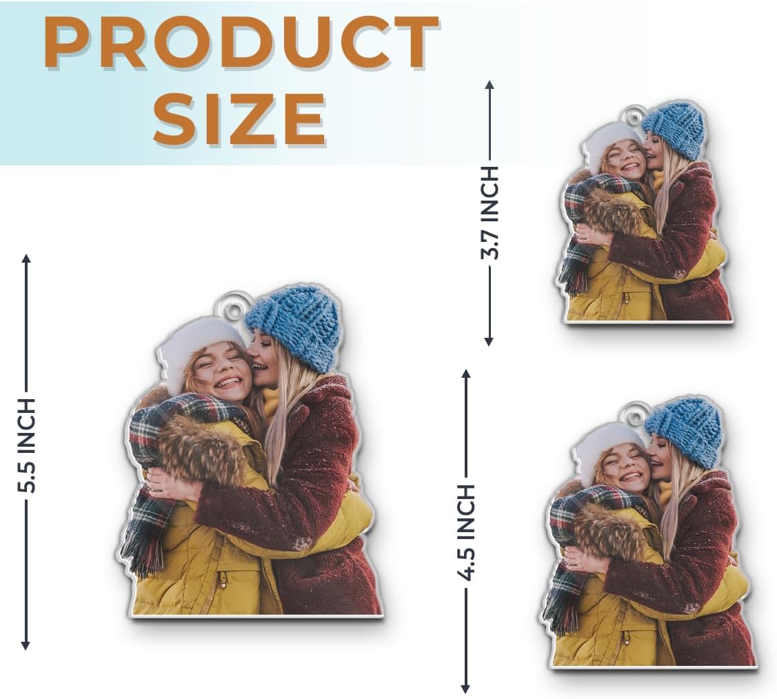 - 🎄 Custom Ornaments With Pictures: Crafted with high-quality acrylic, this ornament features a height of 3.7 inches (~9.5 cm) and a slim 0.12" thickness, ensuring its durability and lightweight design. The ornament can be customized with your photo, which makes it a truly personal and cherished gift. We include a hanging gold cord loop to easily hang on your Christmas tree or an ornament stand.