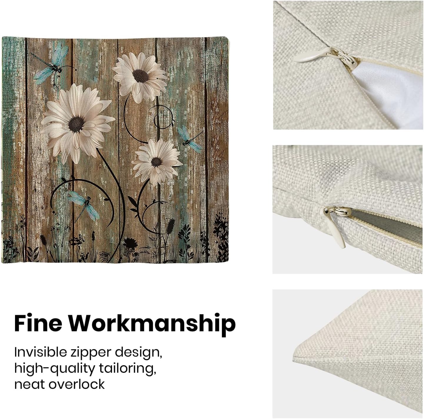 - 【Square Pillow Covers Size】 Wood Texture daisy pillow case set includes 2 pcs of farmhouse couch pillow covers (NO Pillow). Home decor farmhouse pillow covers measures 18x18 inch/ 45x45 cm. All the dragonfly floral decor throw pillow covers have a hidden zipper. It is easy to insert or remove the pillow core to replace the spring pillowcase. Easy to clean and wash, durable and not easy to damage.