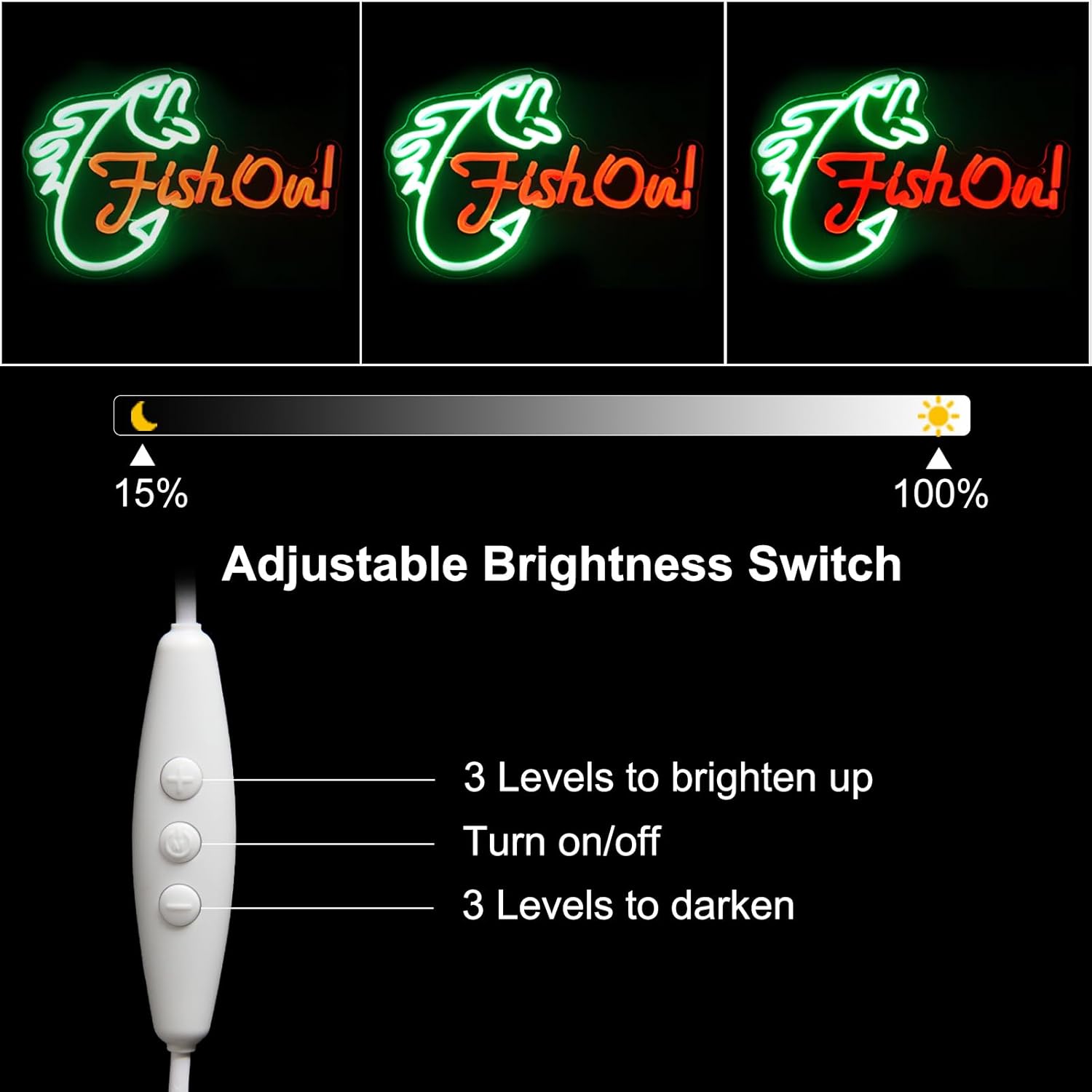 - 【Intelligent Adjustment】Fishing neon sign for wall is equipped with a super-intelligent dimming system, which can meet different lighting needs. The middle button to turn ON/OFF the neon light sign, the UP and DOWN buttons to adjust the brightness of neon lights. The brightness of a neon wall light can be adjusted according to your preferences and ambient light.