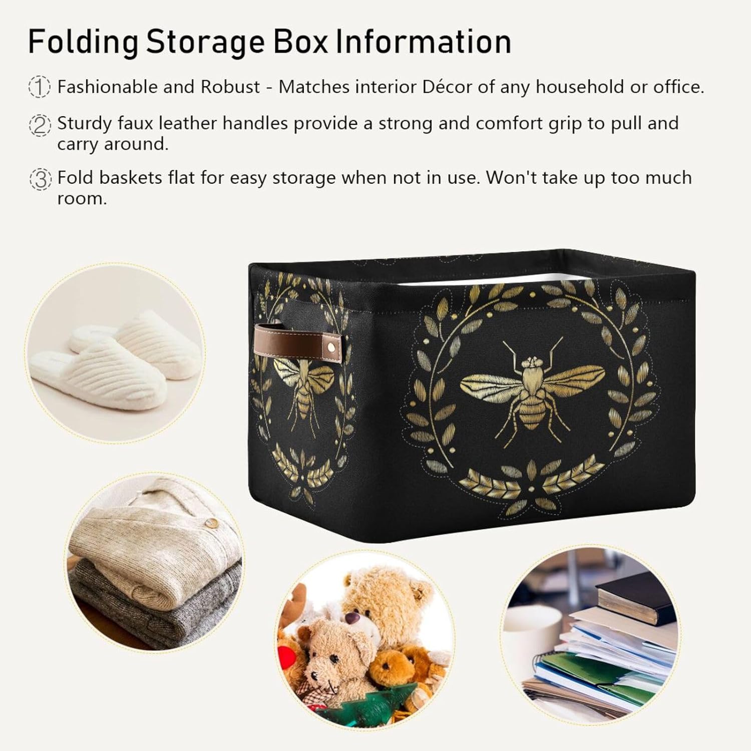 - DECORATIVE CLOSET ORGANIZER: Large foldable storage baskets provide a stylish touch to any room! Brown faux leather handrails blend seamlessly into home decor. These aren't just practical, they're fashionable too - home organizing never looked so good! Home, meet sweet.