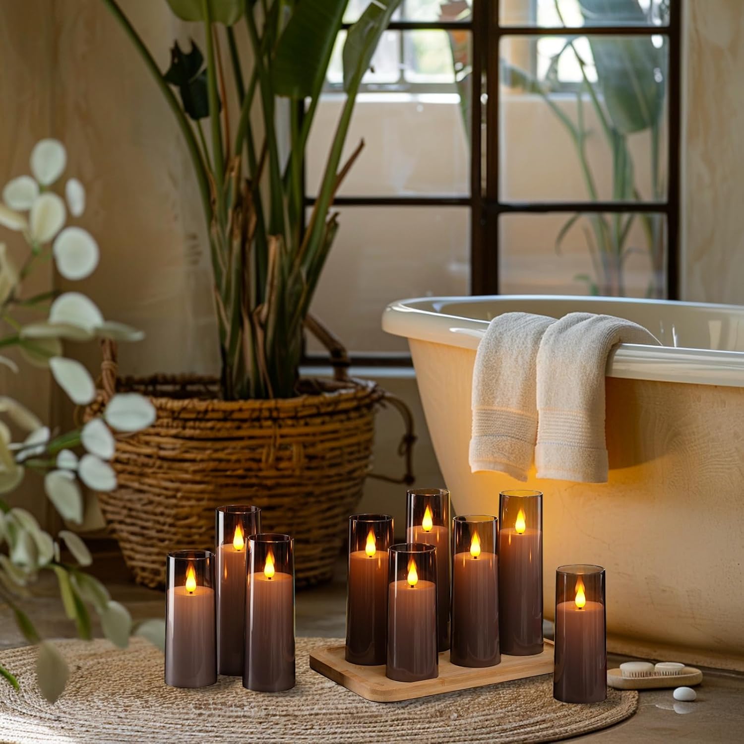 - Package Includes: This battery operated candle set includes 9 flameless pillar candles( D2.2”x H5”6”7”), two 10-key remote control, and a user manual. Each flameless candle is powered by 2 x AA batteries (not included) which can last for 500+ hours