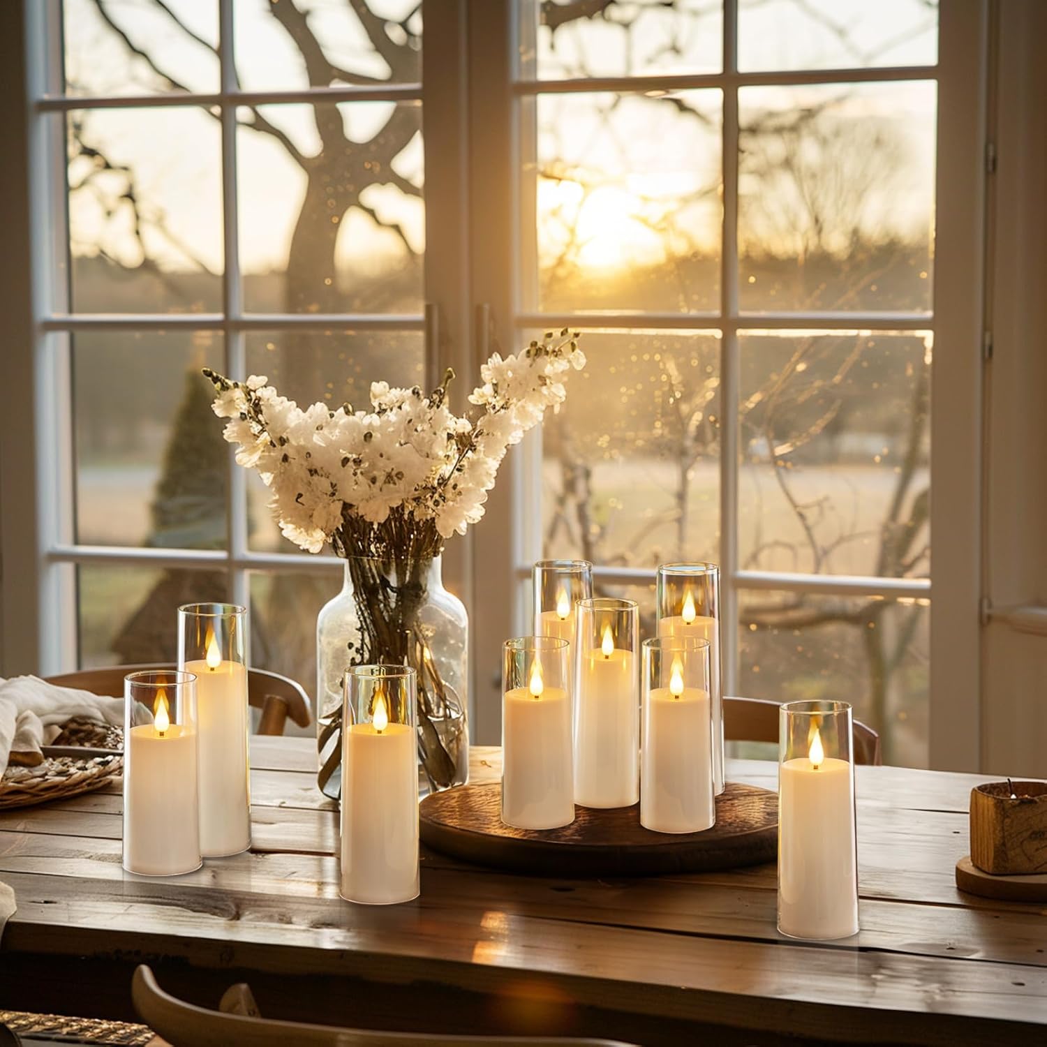 - Realistic Flameless Candles: Acrylic Candle Shell + 3D flame, flickering softly and giving these battery candles a warm yellow and blue glow, creating a cozy feeling, which is perfect for home, festival decorations, and gifts