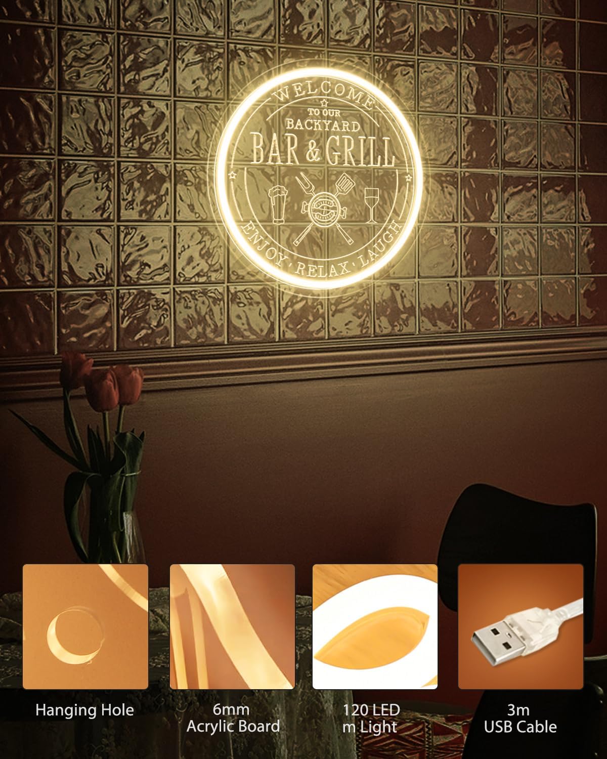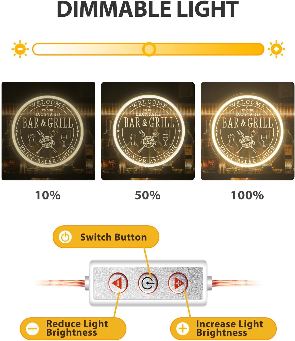 - ✨【10-Level Dimmable】Customize your bar grill signs experience with our 10-level dimmable feature! Adjust the brightness of your neon sign to match your mood or ambiance. Whether you want a subtle glow or a bright, vibrant display, you can easily adjust it to your preference with our easy-to-use dimming controls.