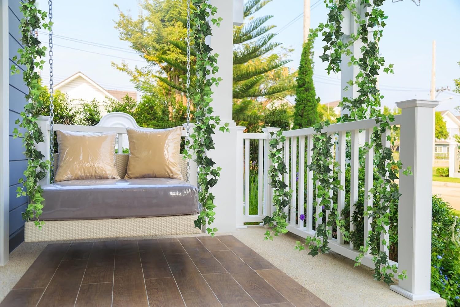 - đăWidely UsedăFaux ivy is very suitable for decorating living rooms, windows, walls, pipes, doors, mirrors, railings, fences, stairs, etc. Ivy can also decorate your wedding, spring/summer home, birthday parties, holiday parties, etc., adding a touch of natural atmosphere and beauty to indoor and outdoor decoration.