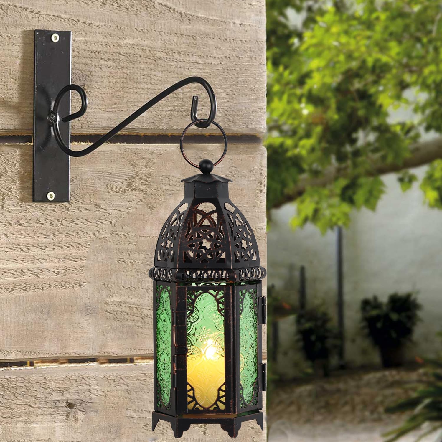 NEEDOMO Hanging Moroccan Lantern, 11'' Vintage Candle Holder, Metal Lanterns Decorative Indoor Outdoor, Table, Patio, Porch, Shelf, Gothic Home Decor (Green, Medium Size)