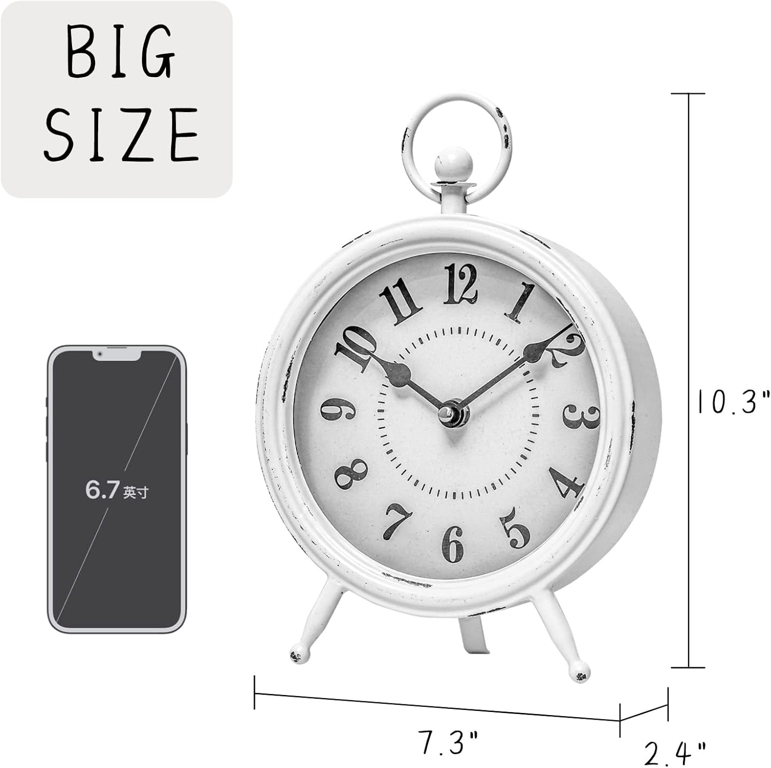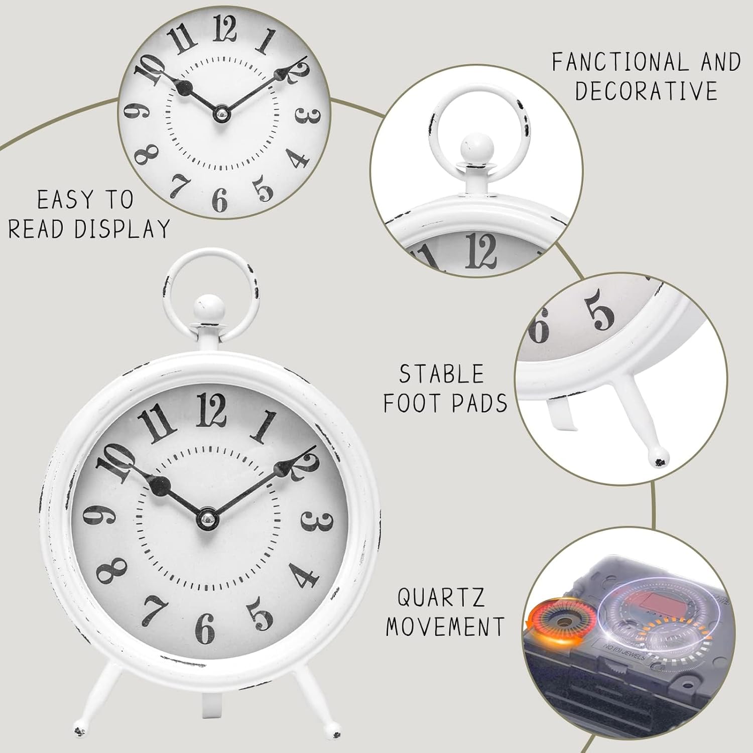 Vintage Rustic White Table Clock on Stand, Decorative Desk and Shelf Clock Farmhouse Mantel Clock Rustic Non-Ticking Clock