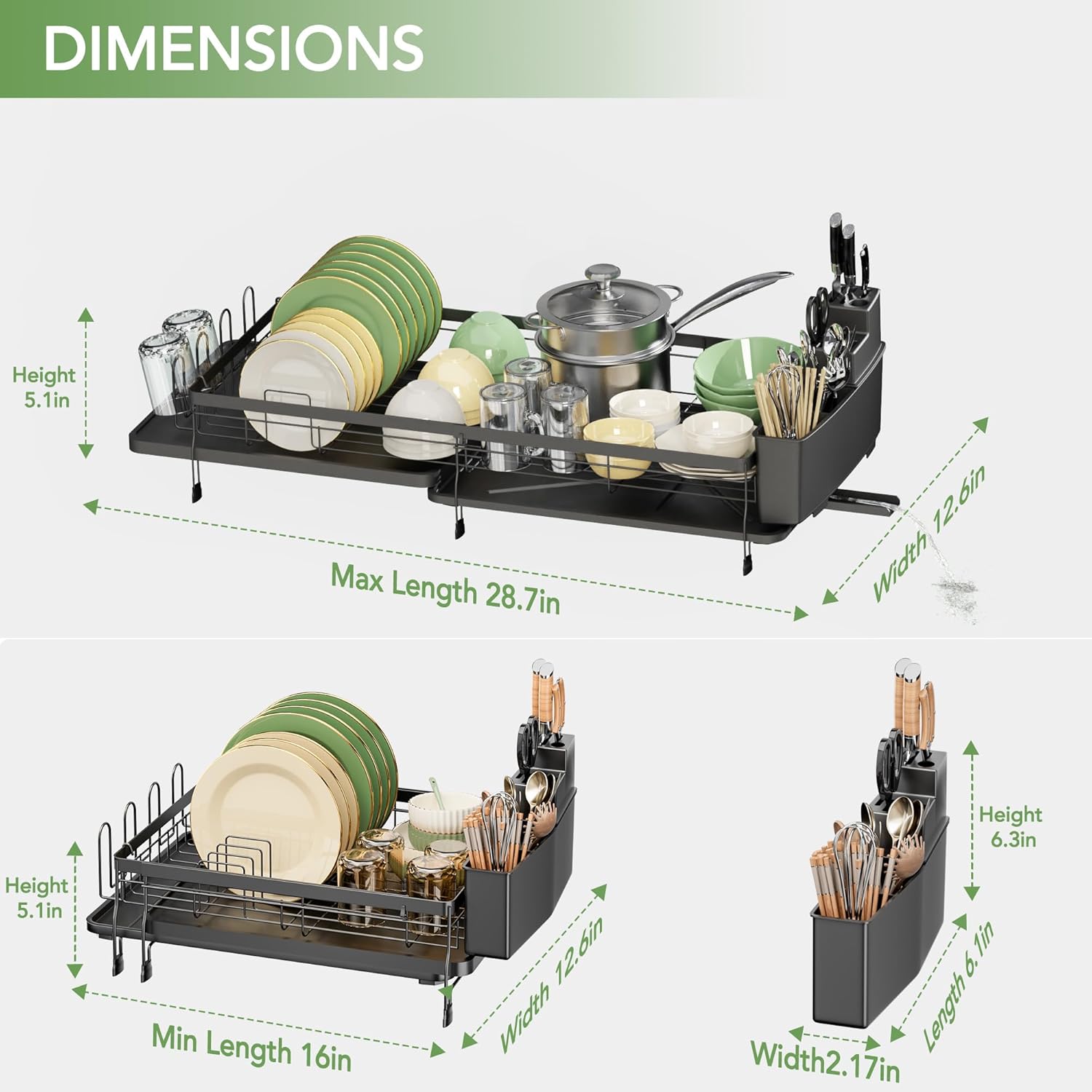 - Expandable Design:ROTTOGOON kitchen dish drying rack with an extendable design can be adjusted to fit different kitchens. It measures 12.6" W *5.1" H, and from 19.2" to 28.7" in length. This dish racks can accommodate plates, bowls, cups, glasses, and even full-sized pots and pans.Therefore, you can just adjust the extendable tray as you need.