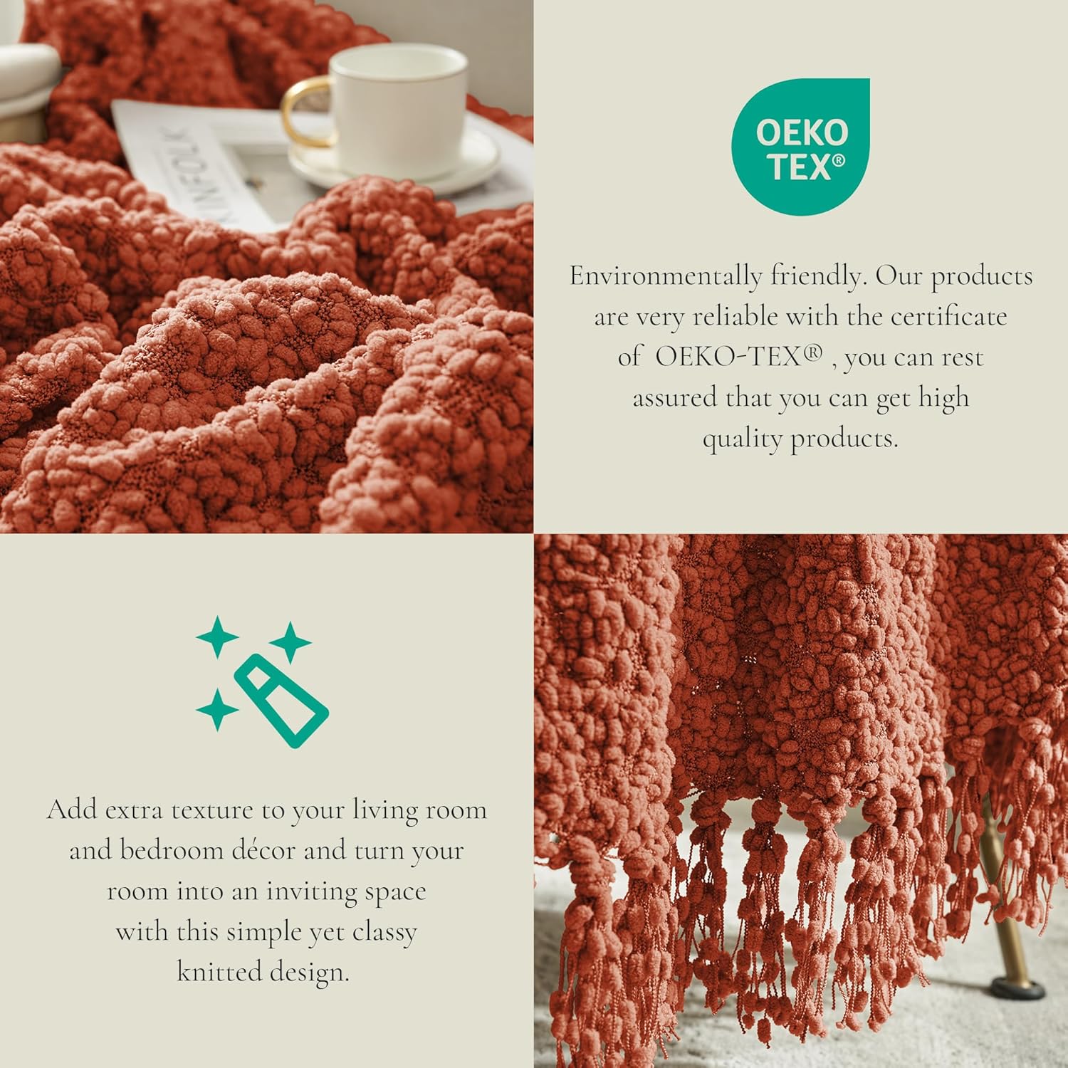 - UNIQUE BOHO DESIGN: Elevate your space with this bohemian-chic knit blanket, featuring artisan geometric weaving and elegant tassels inspired by Provençal craftsmanship. The farmhouse-meets-boho aesthetic adds curated texture to sofas, beds, or accent chairs.