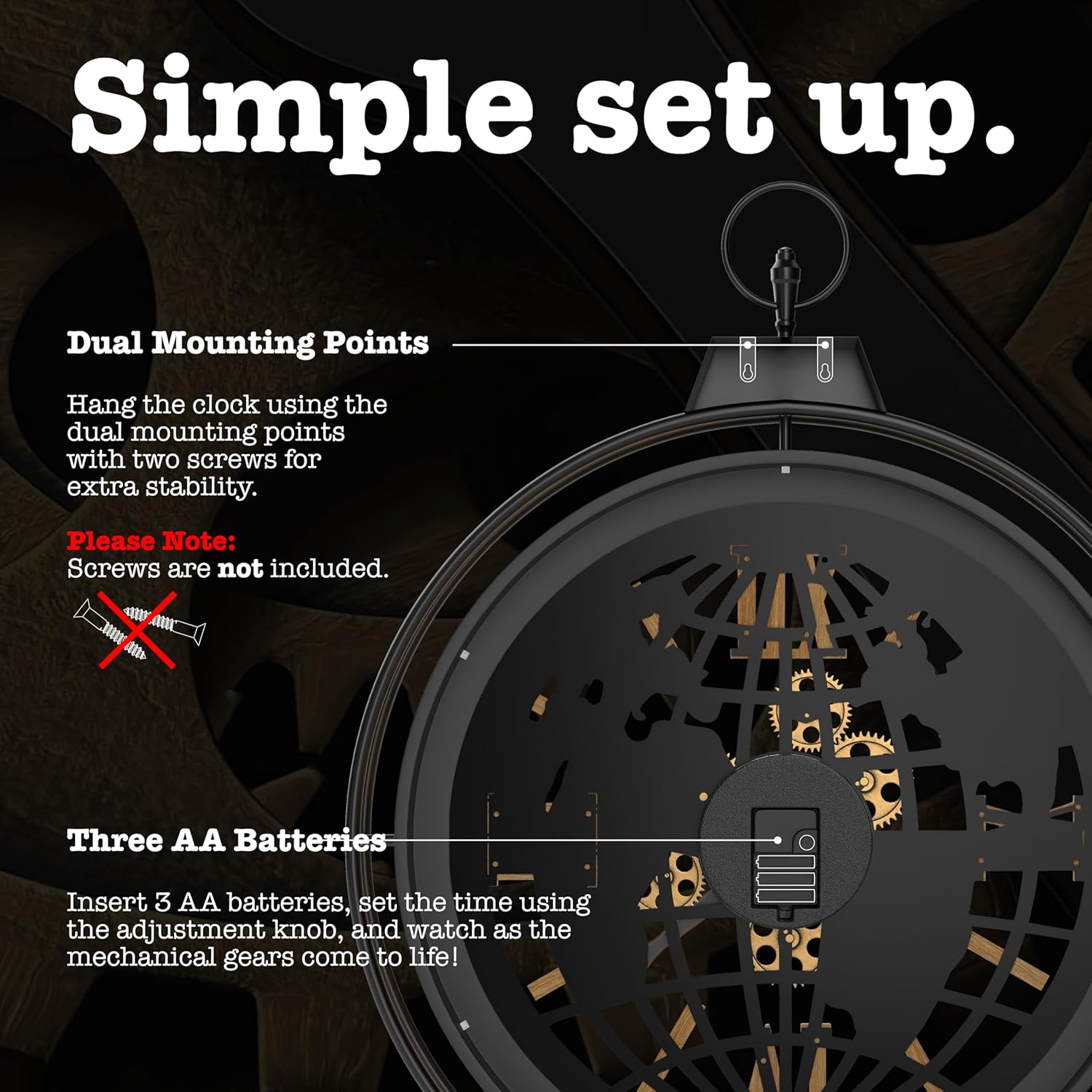 - SIMPLE SET-UP: Insert 3 AA batteries (not included) and set the time using the adjustment knob on the back. Hang the clock using the dual mounting points with two screws for extra stability. NOTE: Screws are not included, allowing you to choose the most suitable type for your wall.