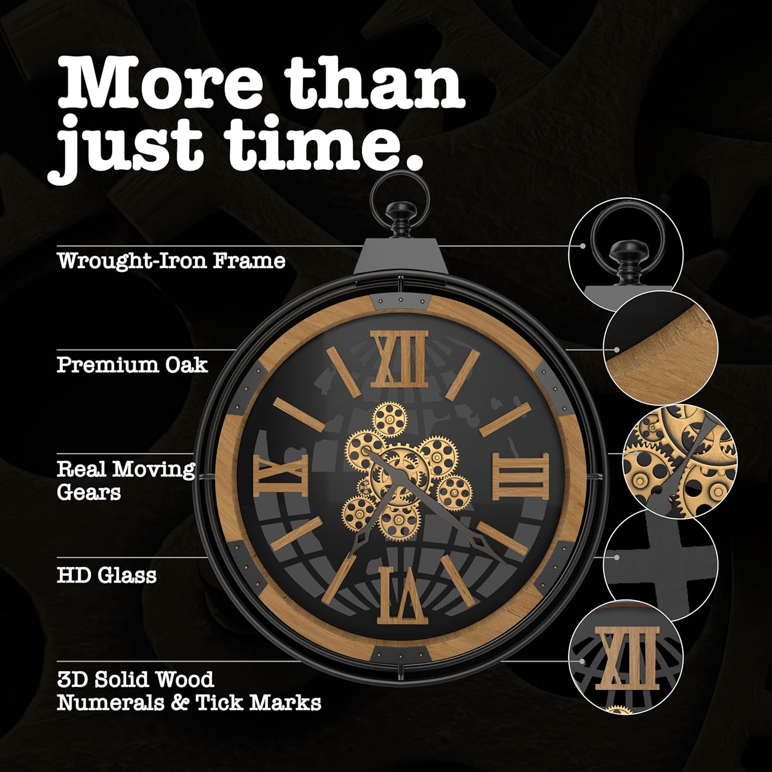- TIMELESS STYLE: Stay on schedule with your new Driini Large Rustic Wall Clock. This oversized, 30 inch moving gear wall clock features a premium wooden frame, and a decorative black wrought-iron skeleton. The clock face is protected by a HD tempered glass for clear visibility and durability. A big, looped handle on top adds to its aesthetic as an industrial steampunk clock or gothic clock, while also invoking nautical and farmhouse vibes. Hand-cut 3D solid wood Roman numerals and tick marks are individually mounted to ensure visibility from any angle.