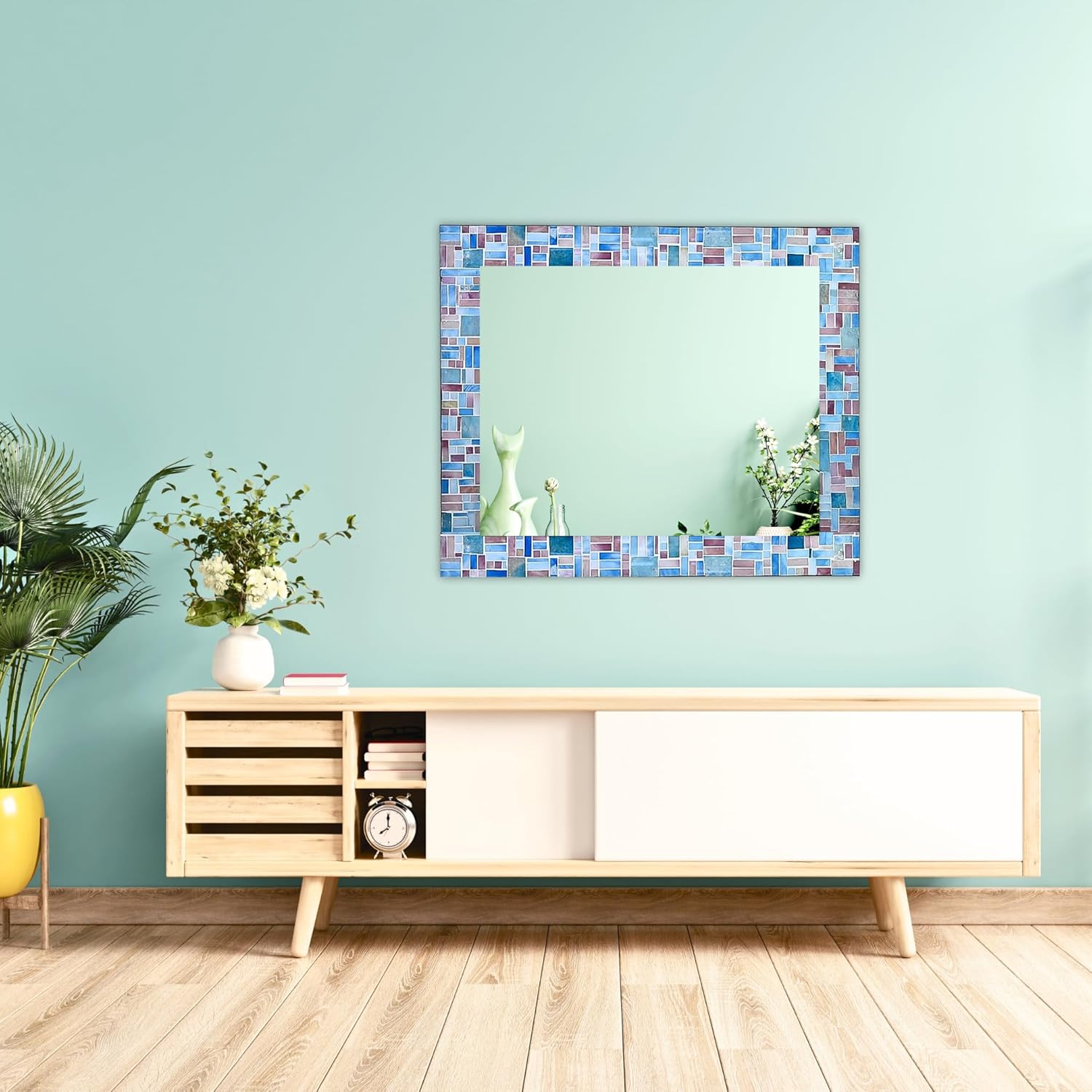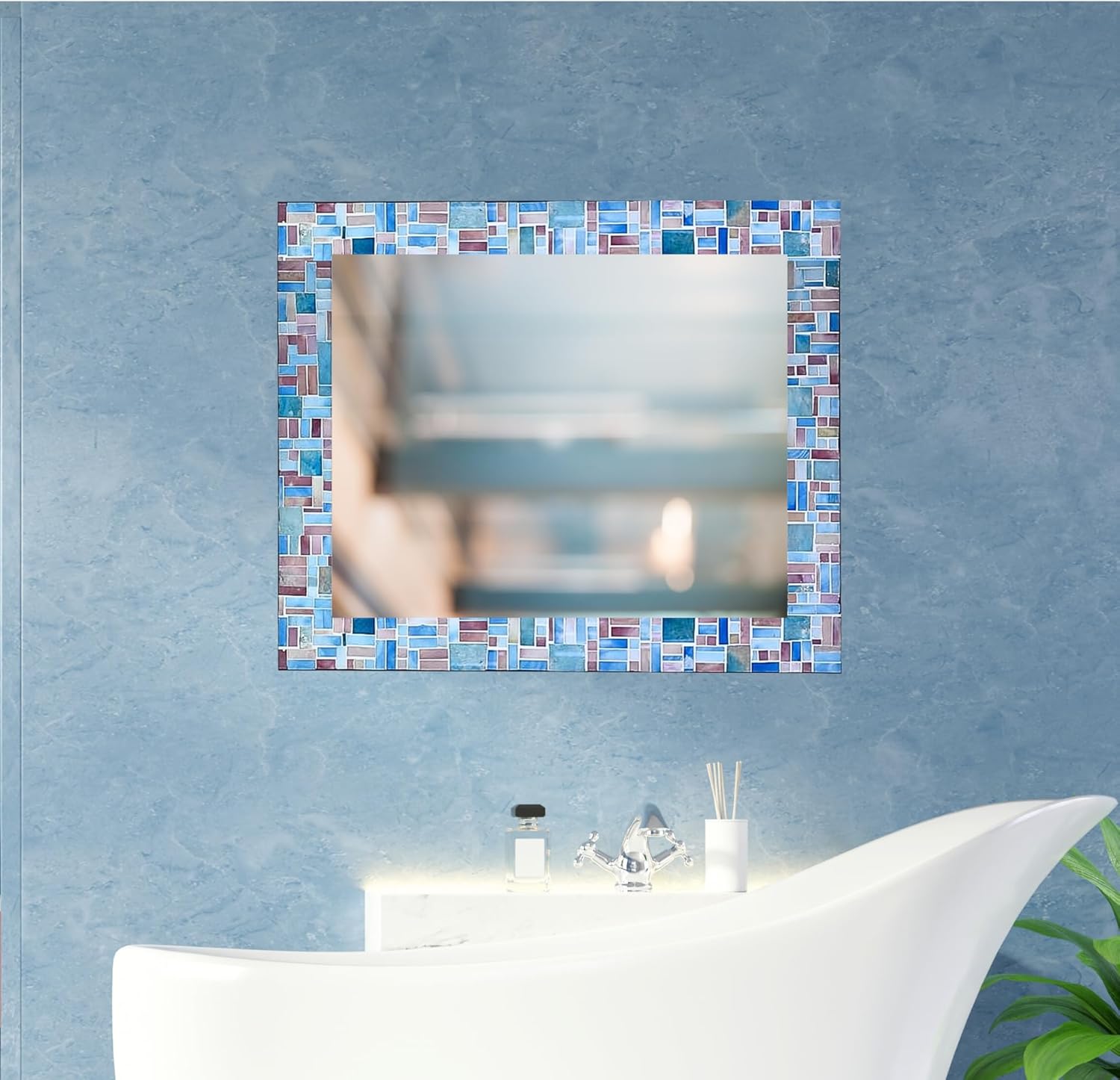 30x24 Rectangular Shape Iron Frame Wall Mirror with Glass Mosaic Tiles- Multi Blue for Vanity, Bathroom, Living Room, Home Decor