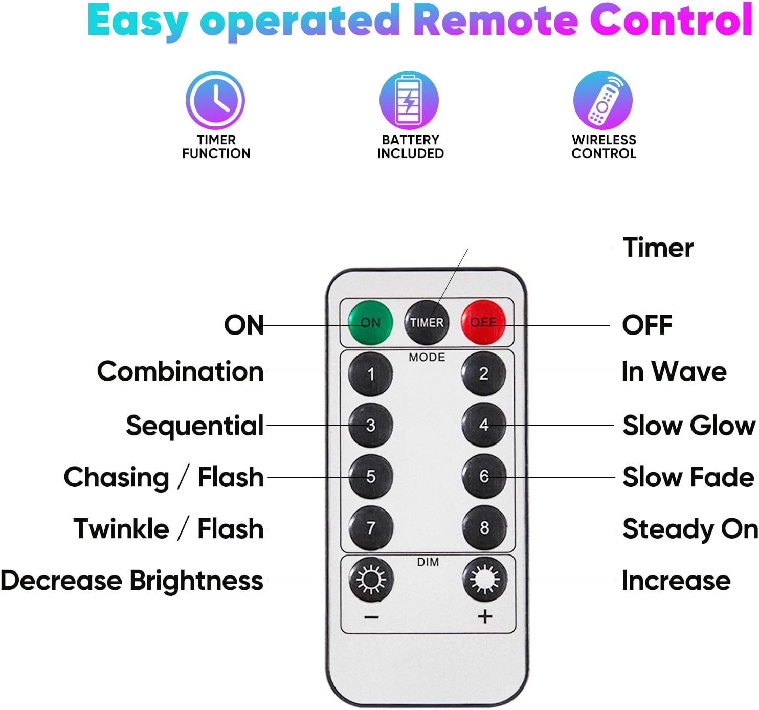 - Remote Control Convenience: Easily switch between 8 unique lighting modes and adjust brightness with the included remote; features timer for automatic 6 hours on, 18 hours off cycle.