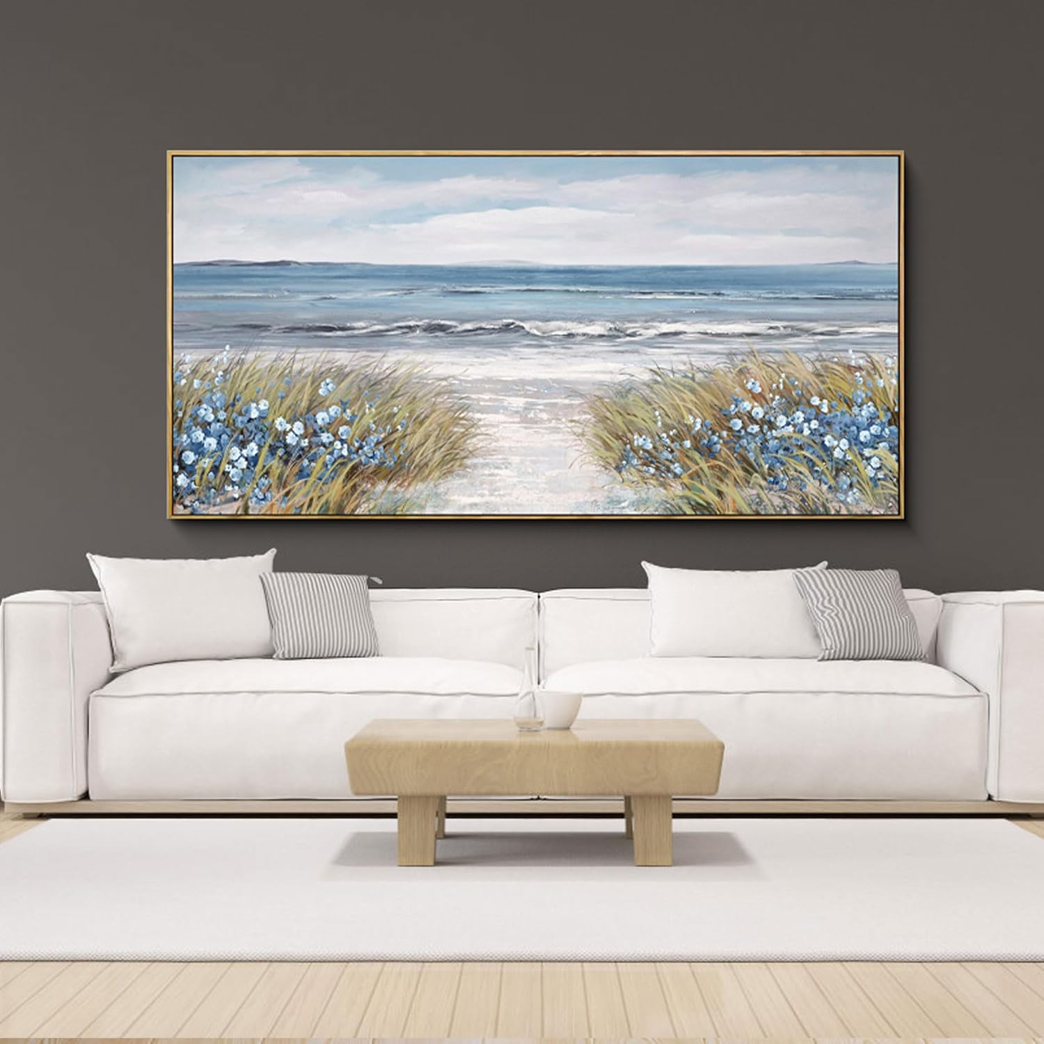 - Large wall art for living room decor size :This vintage blue floral seascape picture artwork measures approximately 29x58 inches, and the view shown of the coastline and horizon is very wide and calming.