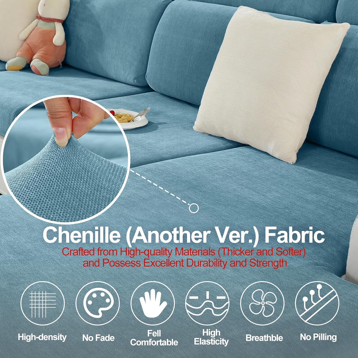 - 【High-Quality Material】These are our new sofa seat covers made with Chenille fabric (another version - thicker and more comfortable), offering exceptional durability and strength. They not only provide a fresh look for your sofa cushions but also protect against wear and stains, ensuring that your sofa maintains its beauty and resilience over an extended period, thereby prolonging its lifespan.