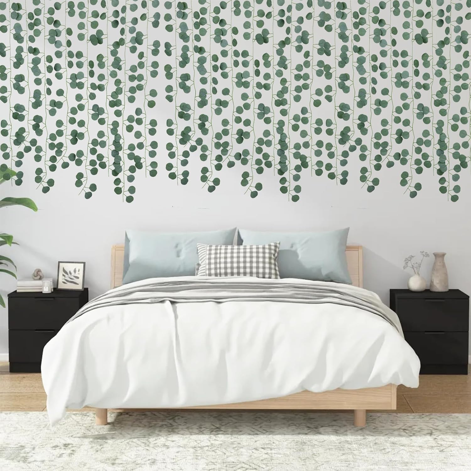 - NATURAL LOOKING DECOR: This artificial eucalyptus garland uses a blend of green and silver leaves to mimic the look of eucalyptus vines hanging in a natural setting.