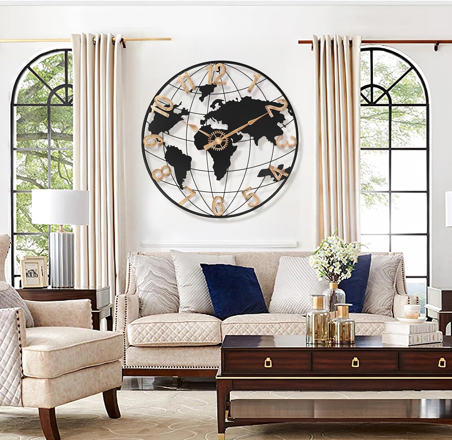 24 Inch Large Wall Clock for Living Room Decor,Big Modern Decorative Silent Metal World Map Wall Clock with Vintage Gold Arabic Numeral for Office,Living Room,Kitchen,Dining Room