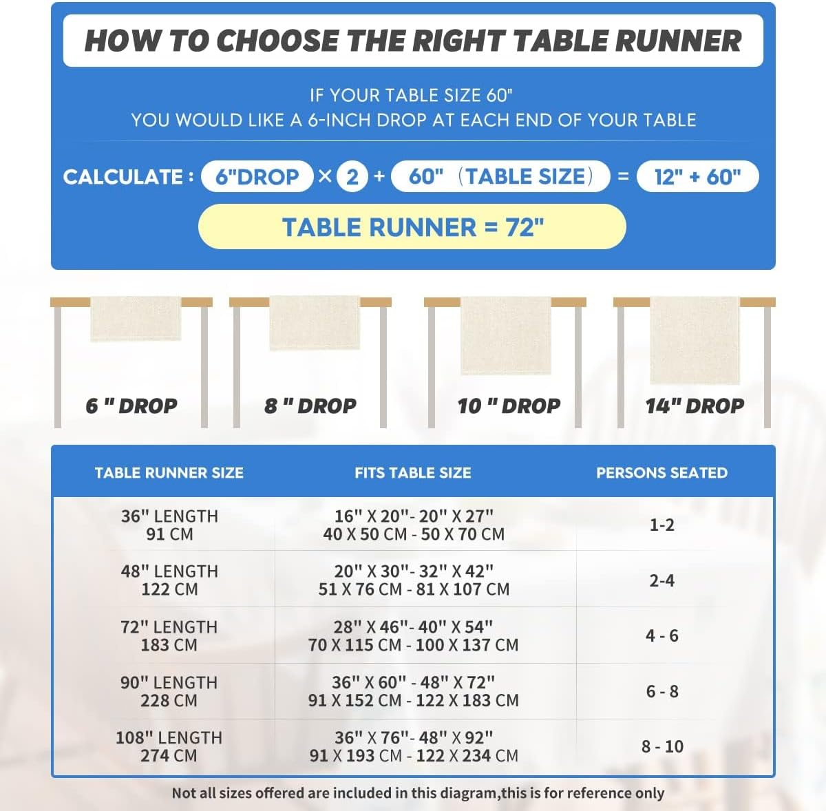 - Fits Table Size : This table runner is 13 x 72 inch, appropriate for a table that can seat 4-6 people, better match your table and give you a delightful dining experience