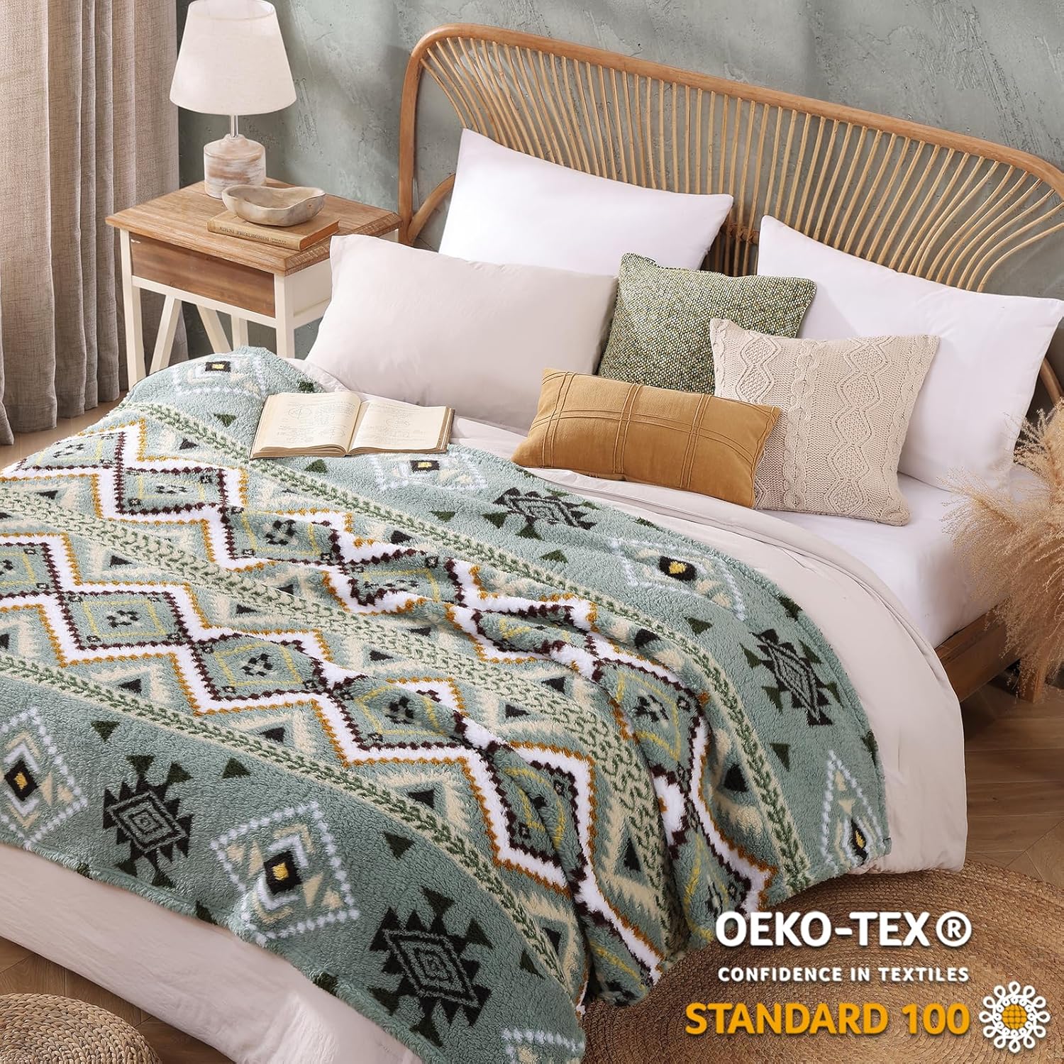 CASAAGUSTO Boho Sherpa Blanket, Aztec Twin Blanket,Ultra Soft, Warm, Cozy, Plush, Thick Fleece Throw Blanket for Couch, Bed, Sofa (Olive Green 60 * 80 Inch)