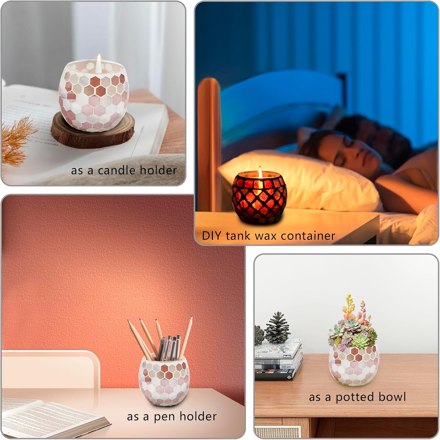 - NOT ONLY A CANDLE HOLDER - With its unique mosaic design and Gothic floral patterns, this votive candle jar is not just a candle holder, it can also be used as a potted plants bowl, makeup brush holder, or office pen holder, adding a touch of vibrant color to your desk, vanity, or windowsill