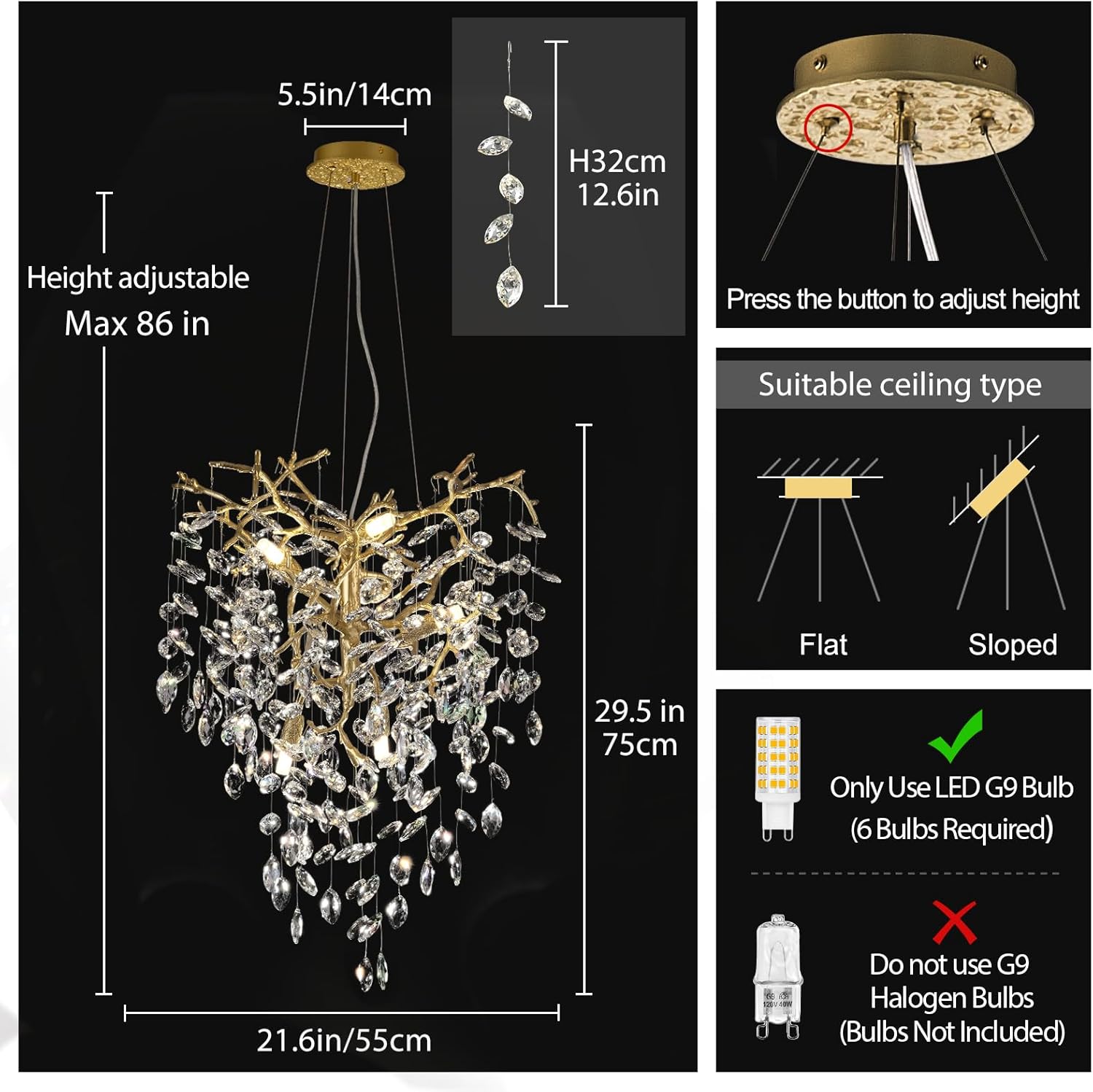 - Lighting Requirements:Please note,our gold crystal tree branch chandelier does not include light bulbs.Featuring multiple light sources,it operates on a 110V AC power supply and requires 6*LED G9 bulbs.(Bulbs not included)We recommend using warm white light bulbs in the range of 3000K to 4500K for optimal ambiance.Dimming functionality can be achieved with dimmable bulbs and a compatible dimmer switch.