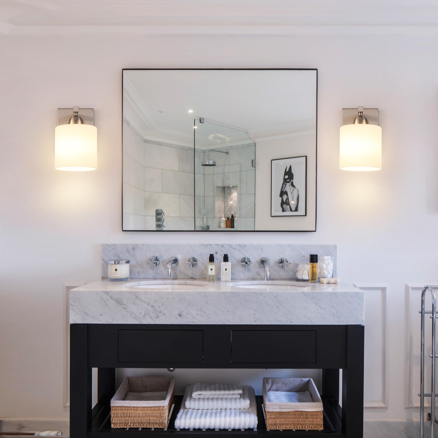 Brushed Nickel Milk Glass Wall Sconces, 1 Pack Hardwired Indoor Wall Light Fixtures for Living Room, Hallway, Bedroom, Ceramic E26 Sockets (Bulbs Not Included)