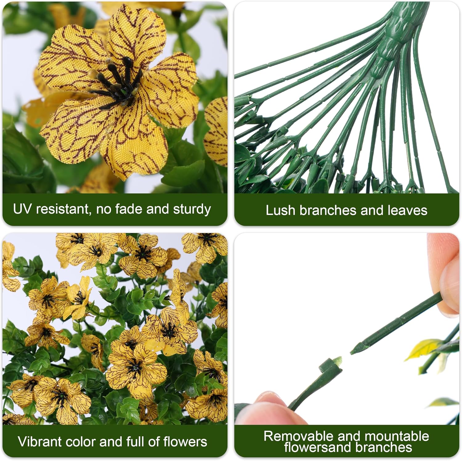 - Durable and UV Weather-Resistant: The fake hanging plants flowers are made of high quality silk cloth and plastic, UV and all weather resistant, waterproof and no fade in the sun and rainstorm.