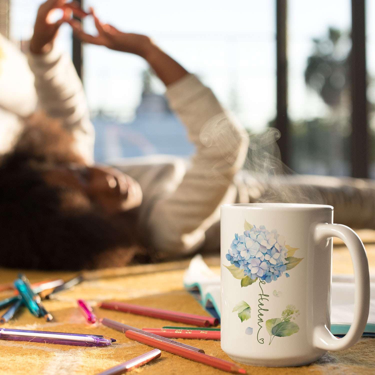 Custom Hydrangea Blossom Design Mug, Personalized Name Blue Flower Coffee Cup, Customized Flower Ceramic Mug For Floral Lover, Hydrangea Decorative Cup 11oz Or 15oz, Gift For Birthday