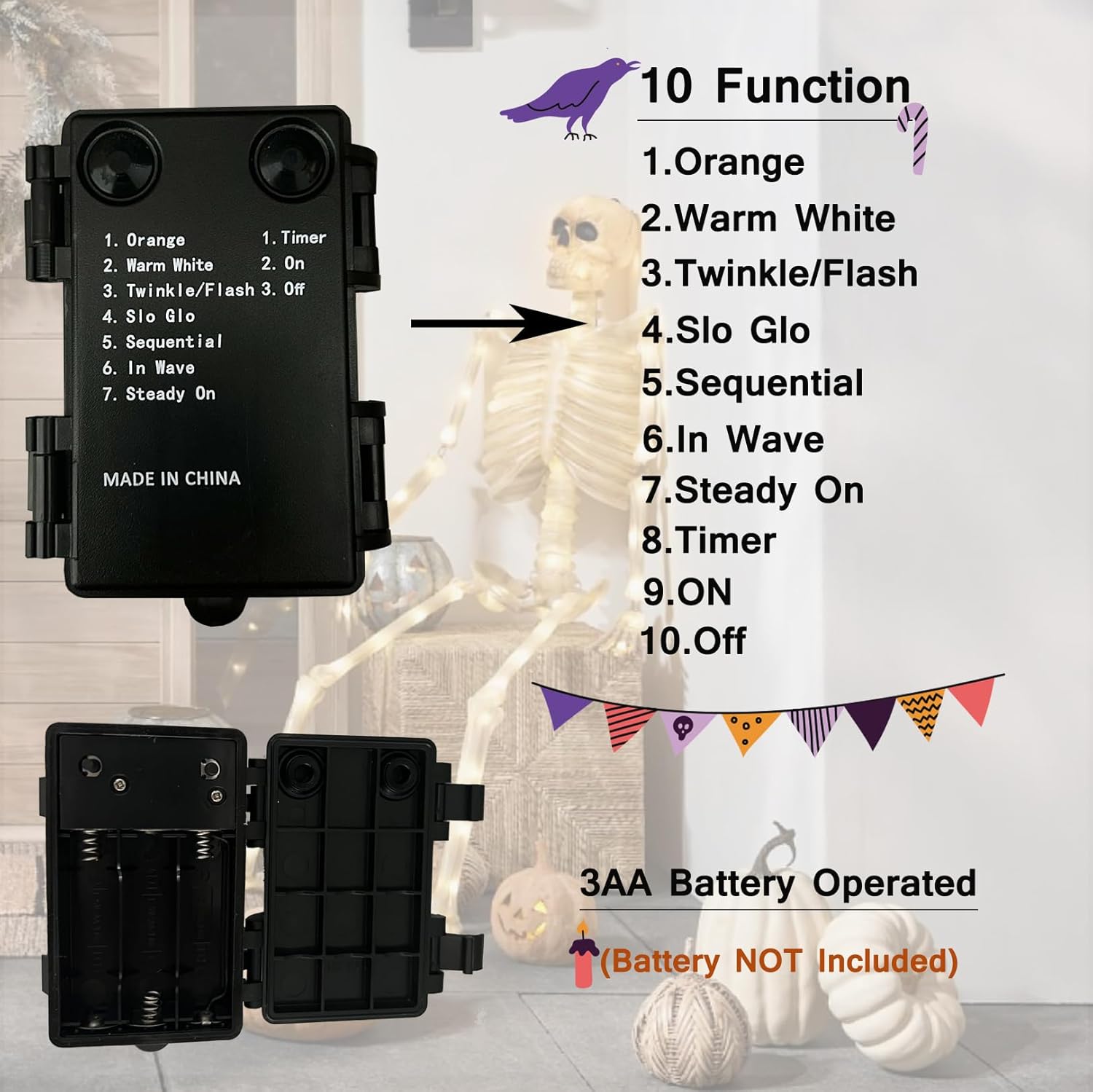 - LIGHTING FUNCTIONS: Featured with 7 lighting functions including orange, warm white, twinkle, slo glo, sequential, in wave and bi color steady on, Requires 3AA battery operated. Light up for 6 hours and then turn off automatically, power back on 18 hours later. Batteries NOT included