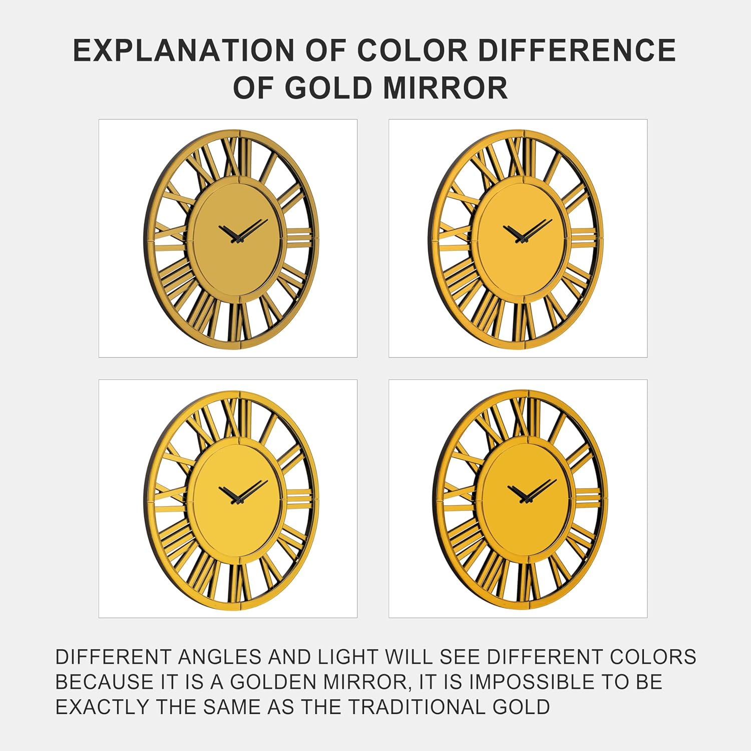 - 【Premium Materials】Constructed with a 4mm thick gold mirror and sturdy MDF backing, the wall clock is equipped with a silent sweep mechanism for accurate timekeeping. The one-piece movement cover safeguards the mechanism, while two robust D-ring hooks guarantee the stability of this large wall clock for enduring use.
