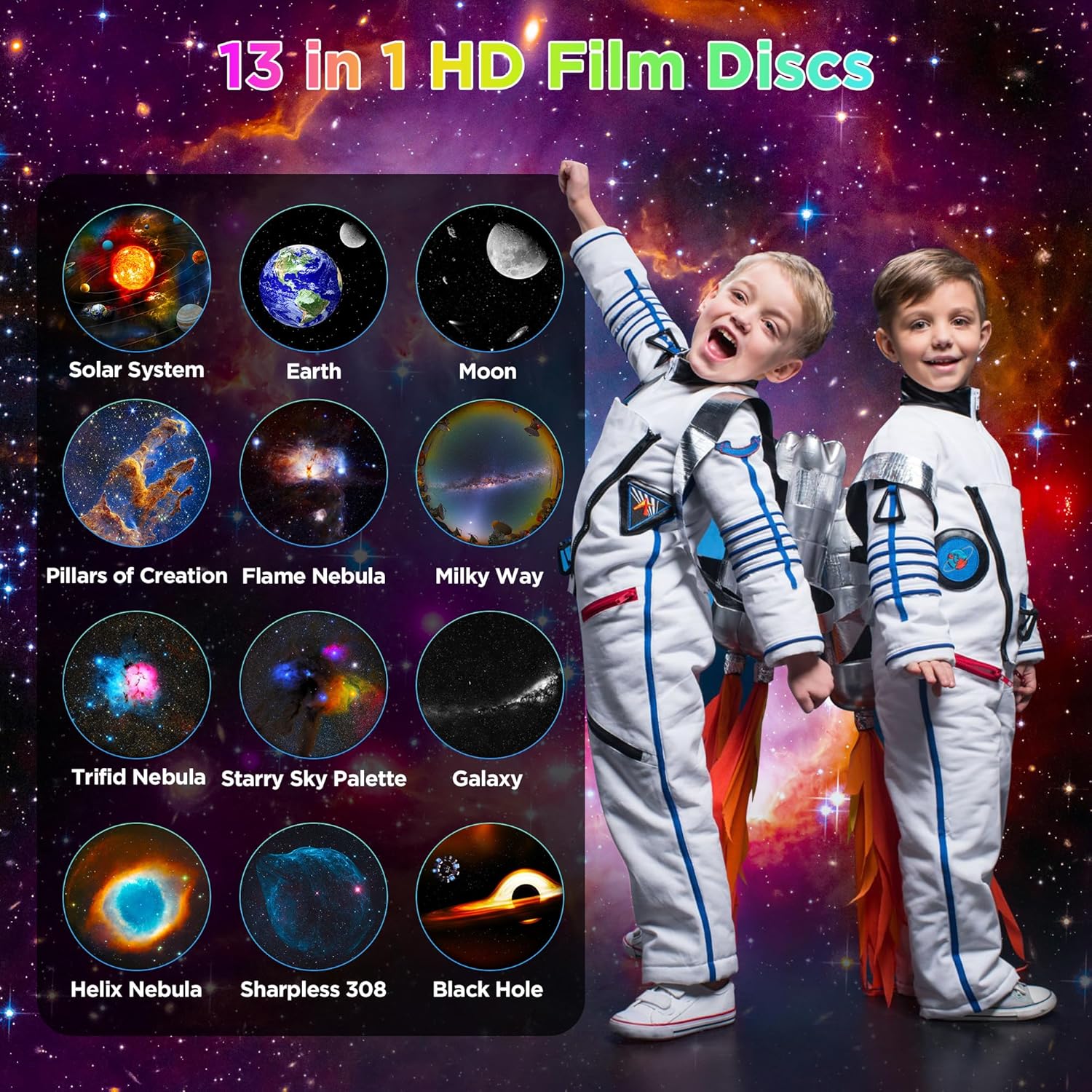 - 13 Different Film Projection Effects : The Light Projector for Bedroom comes with 13 different 4k HD galaxy discs, including the Solar System, Earth, Moon, The Milky Way, Galaxy, Andromeda Galaxy, NGC4302-NGC4298, Hubble Deep Field, M60--UCD1, North America Nebula, Mystic Mountain, and Small Magellanic Cloud. These realistic galaxy film discs offer a fantastic universe experience, making it perfect for bedroom decoration for kids, teen girls, and adults alike.