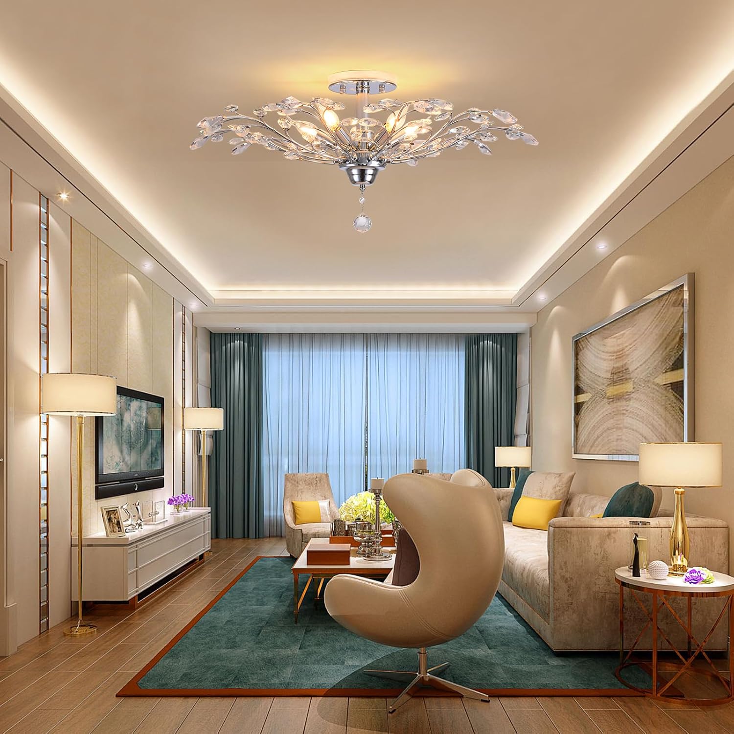 - ▶Modern Design: The chrome ceiling light fixture is beautifully decorated. Features a smooth chrome finish frame with clear K9 crystals to capture and reflect the light from the bulb, pure, romantic, shining like diamond, brings an superior and sophisticated ambiance in any room. Illuminate your home with a touch of modern elegance using this stunning 5-light crystal flush mount ceiling light!
