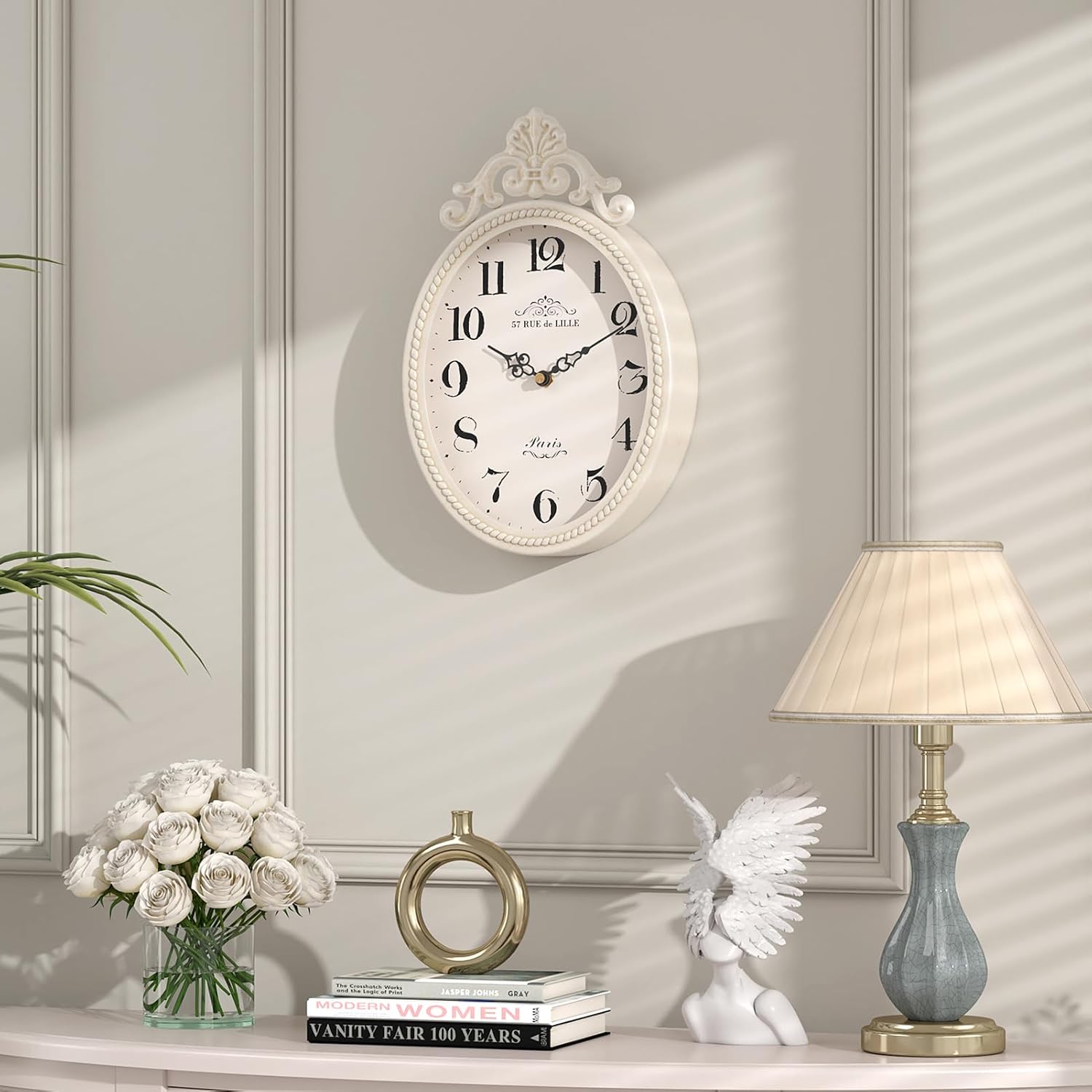 Abdurey Small French Retro Decorative Wall Clock, Ivory White Vintage Oval Style,Silent Battery Operated Boho Decor Wall Clocks for Farmhouse,Kitchen,Bedroom,Bathroom(10.4" H x 6.7" W)