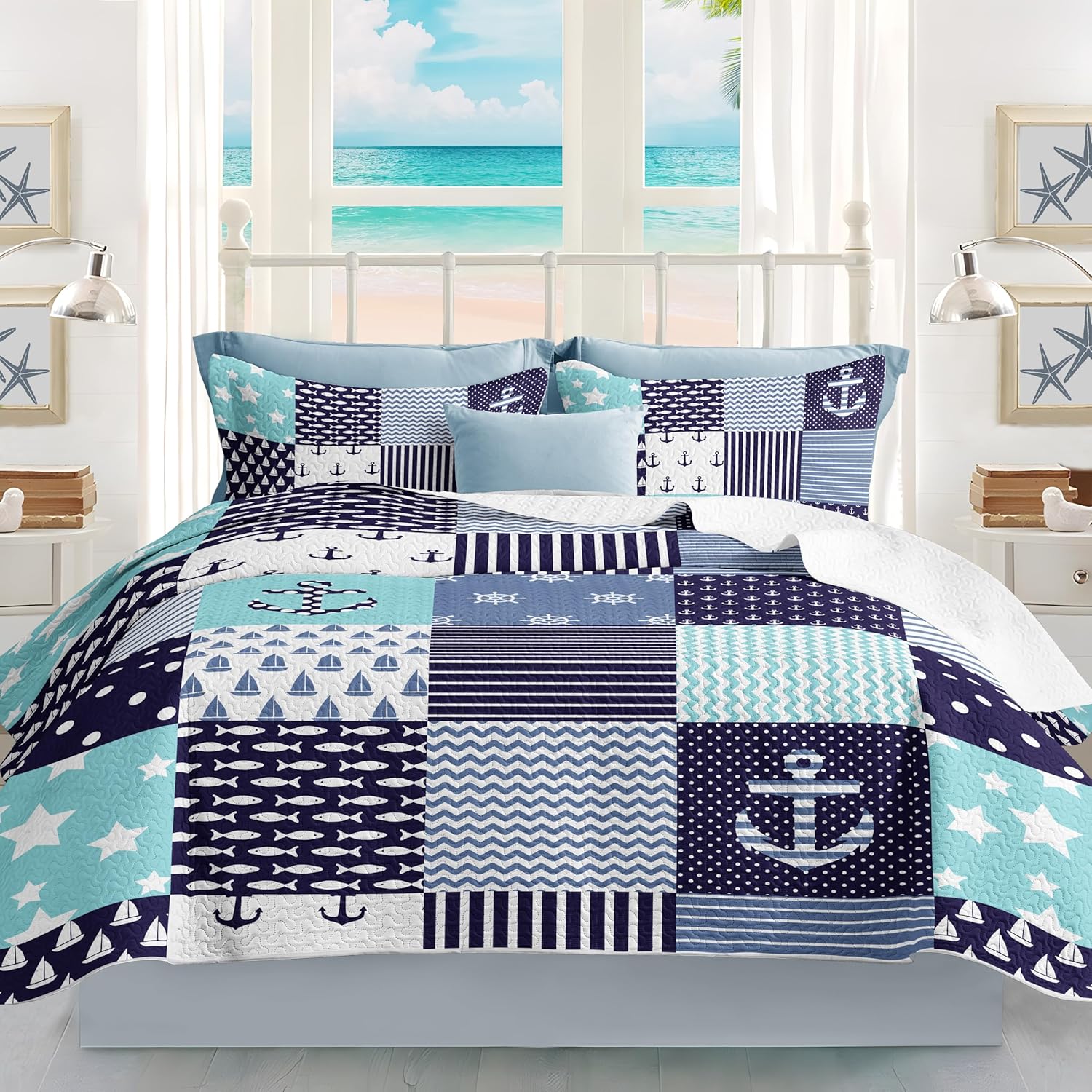 - 【Coastal Design】 Coastal bedding nautical ocean pattern quilt, nautical patchwork quilts set creating a beach atmosphere and making your eyes shine. Light up your bedroom, guest room,vacation room with vivid and stylish coastal quilt bedding set.