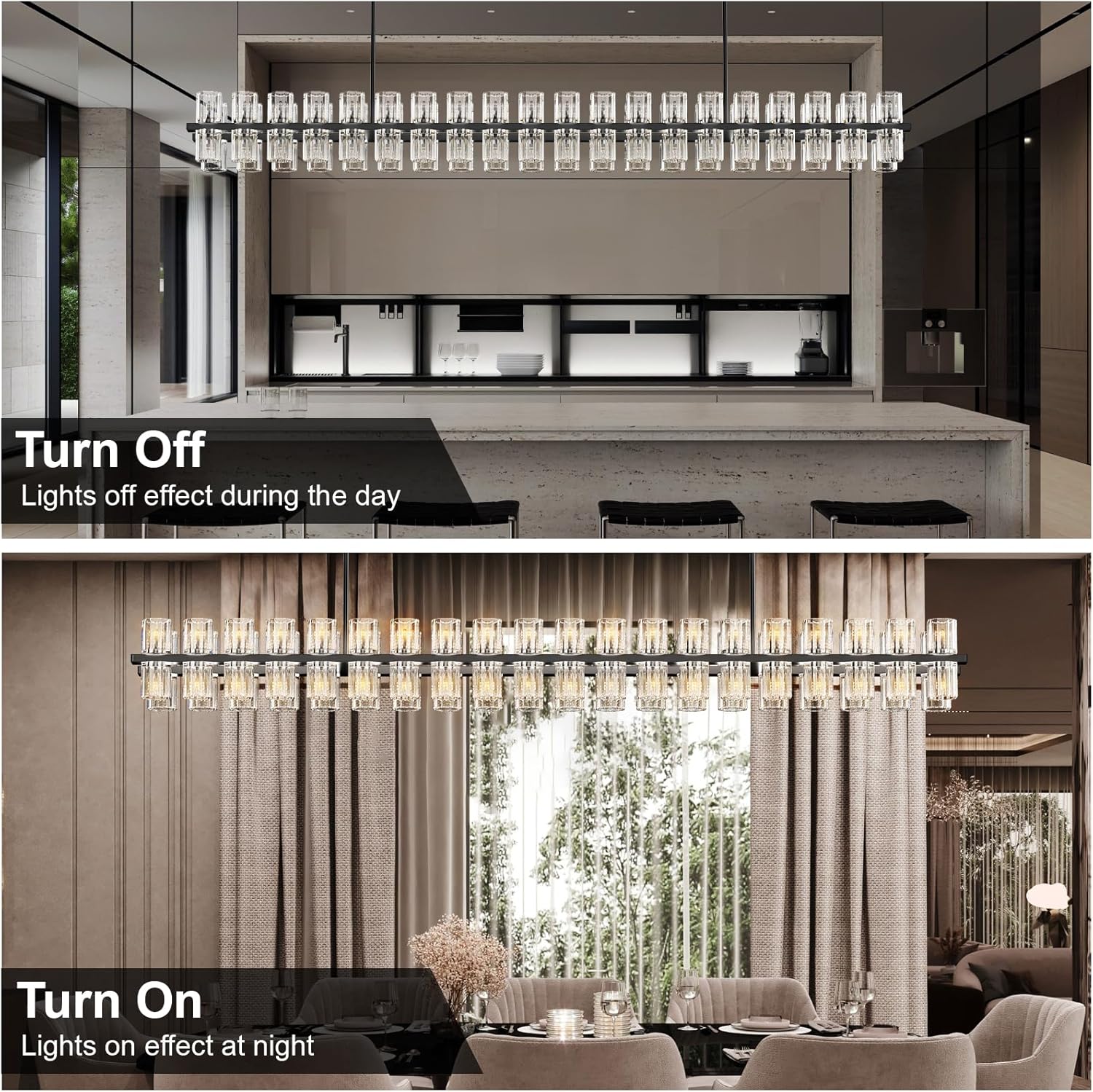 - Exquisite Crystal Chandelier: Crystal Lamp crafted with high-quality K9 crystal and adorned with a sleek black rectangular lamp frame, this dining room chandelier exudes luxury and sophistication. When illuminated, the light reflects through the crystal, creating a romantic, fancy, and radiant ambiance in your room.