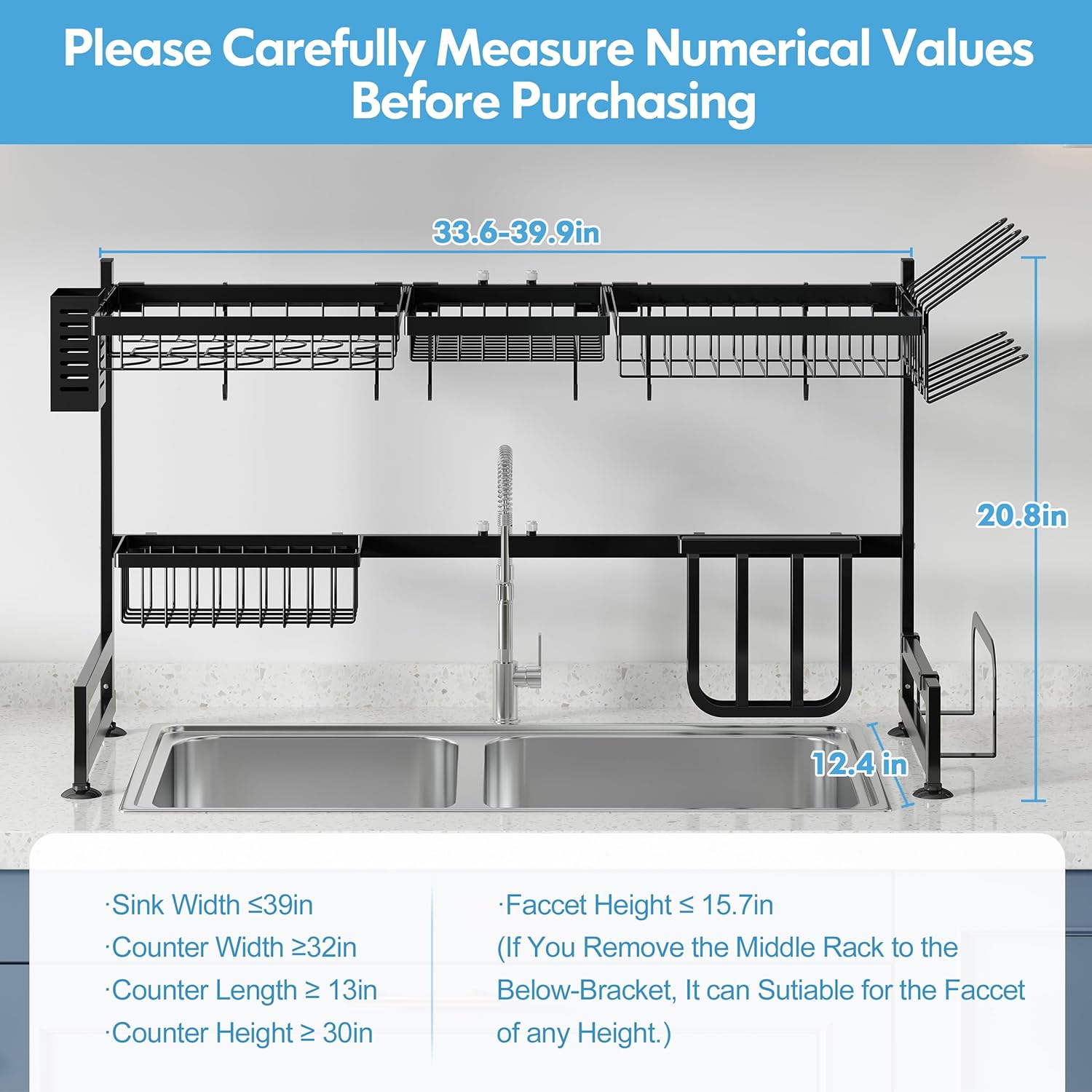 - Fit for the Faucet of Any Height: If you remove the middle rack to the below-bracket, this sink drying rack can suitable for the faucet of any Height. Beside, the size is 33.6 - 39.99 (L) *12.4 (W)*20.8(H) inches.