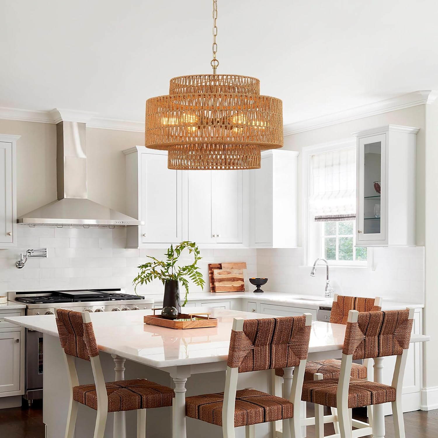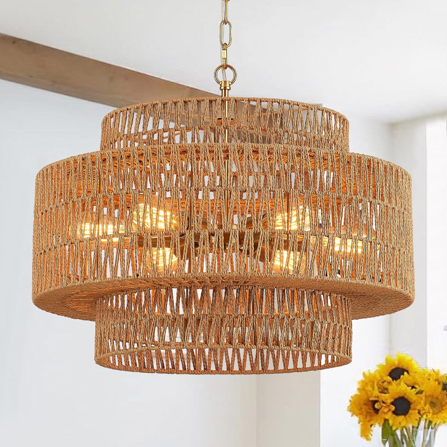 Hand-Woven Rattan Chandelier Vintage Farmhouse 6-Lights Boho Bamboo Chandelier Light Fixture 23.6" Retro 3-Tier Drum Wicker Rattan Golden Chandeliers for Dining Room, Kitchen, Living Room