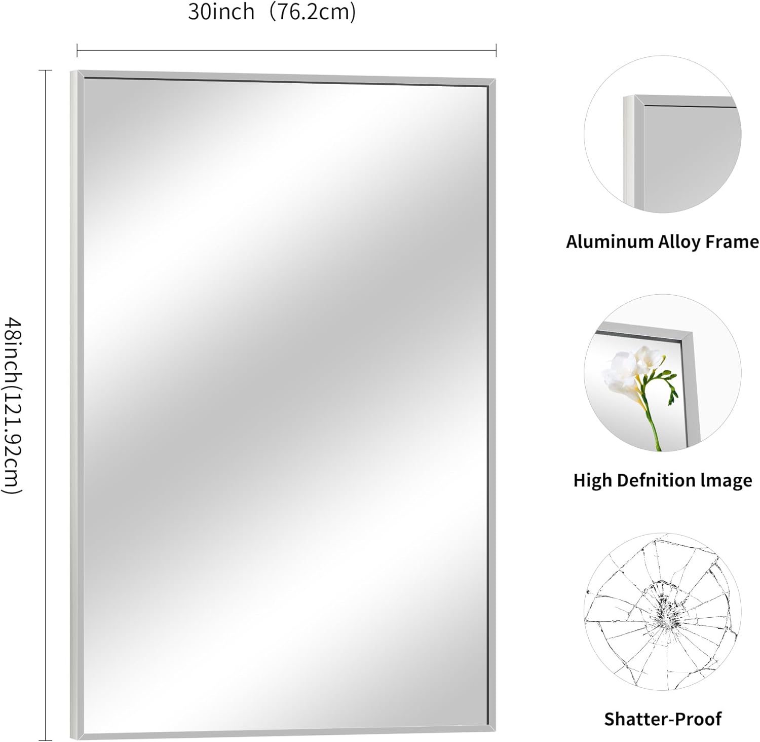 - HD MIRROR,NO DISTORION: COFENY 30X48 mirror is made of premium glass,unbreakable and the reflection is clear and natural,high definition and non distortion, which can give you the most realistic visual enjoyment and long-lasting use need!