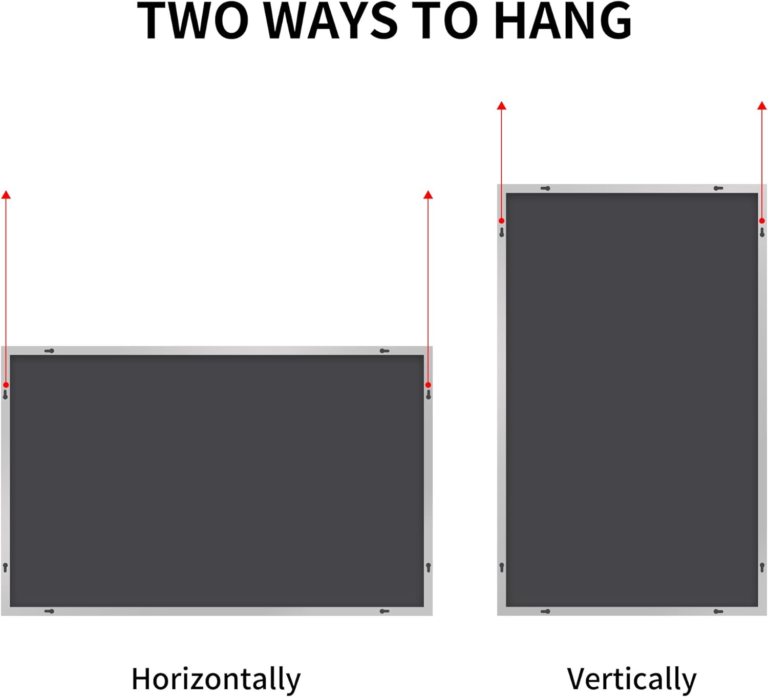 - Note: The mirror supports both horizontal and vertical mounting. Mirror installation requires the use of two sides of the mounting holes, refer to the installation pictures (single side frame can not withstand the weight of the mirror)
