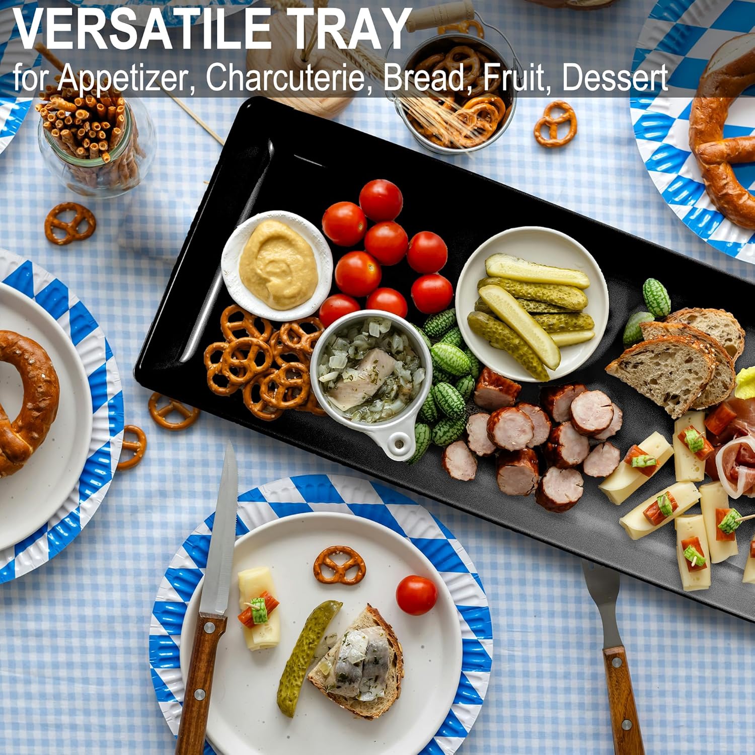 - Versatile Trays - These black minimalist plates are perfect for most serving needs. Serve appetizers or deserts for celebrations, carry snack or fruits on the picnic, use for charcuterie platters, use as bottle/ spices holders to make kitchen neat and well organized
