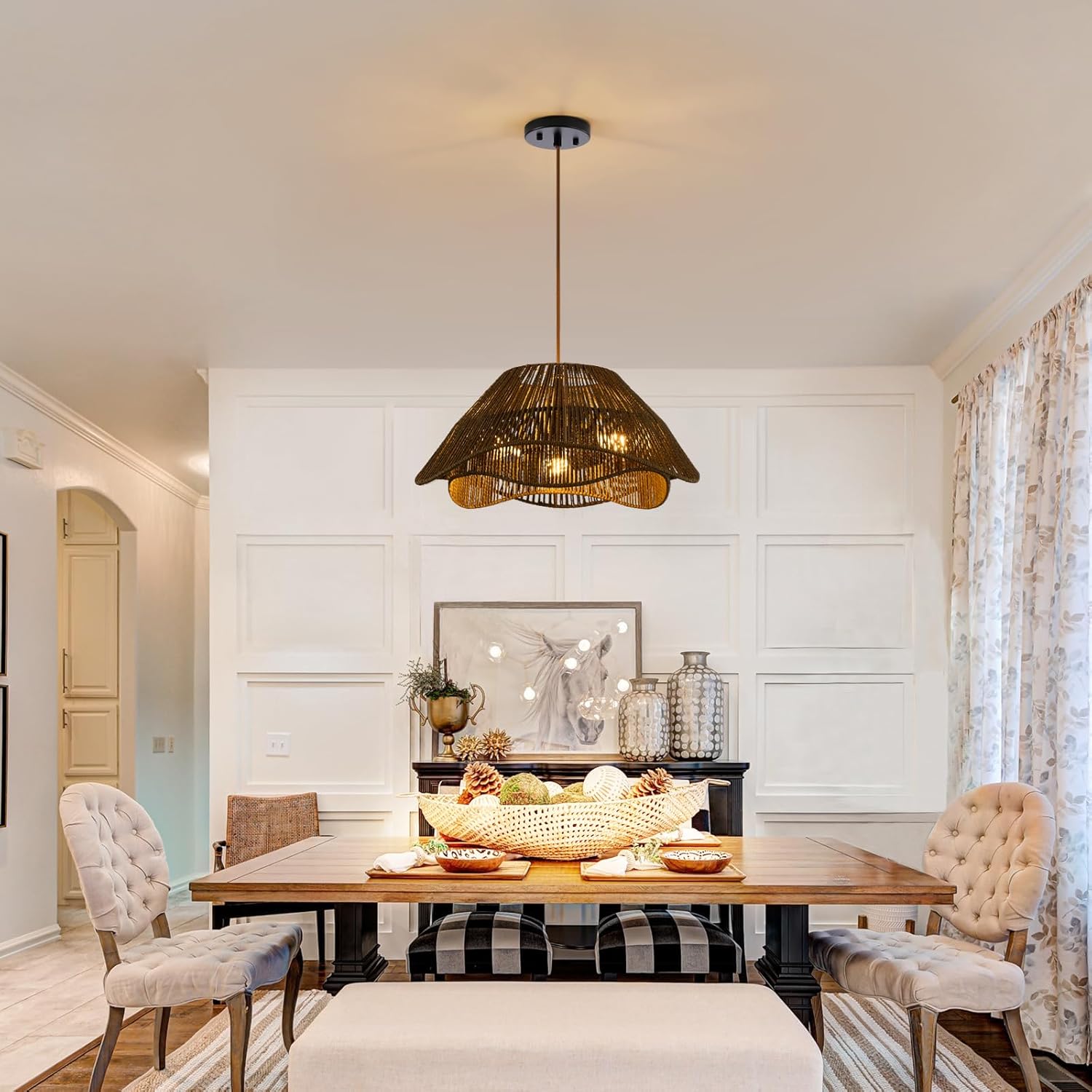 - 【Easy to Install】The boho chandelier for dining room includes all mounting hardware and instruction for quick and easy installation. Simply connect the lampshade to the canopy, connect the household wires and screw the bulb to add a retro elegance to your space!
