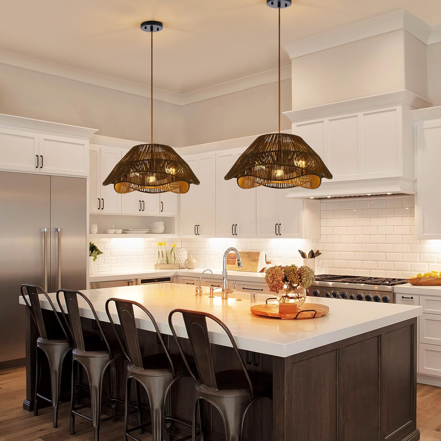 - 【Unique 2-layer Rattan Design】The boho pendant light fixture consists of a hand-woven antique rattan and a quality metal frame, bring a vintage boho style. Light through the double irregularly designed wicker shade to create a charming petal pattern on the ceiling, emits a inviting light and creates a warm and inviting vibe.