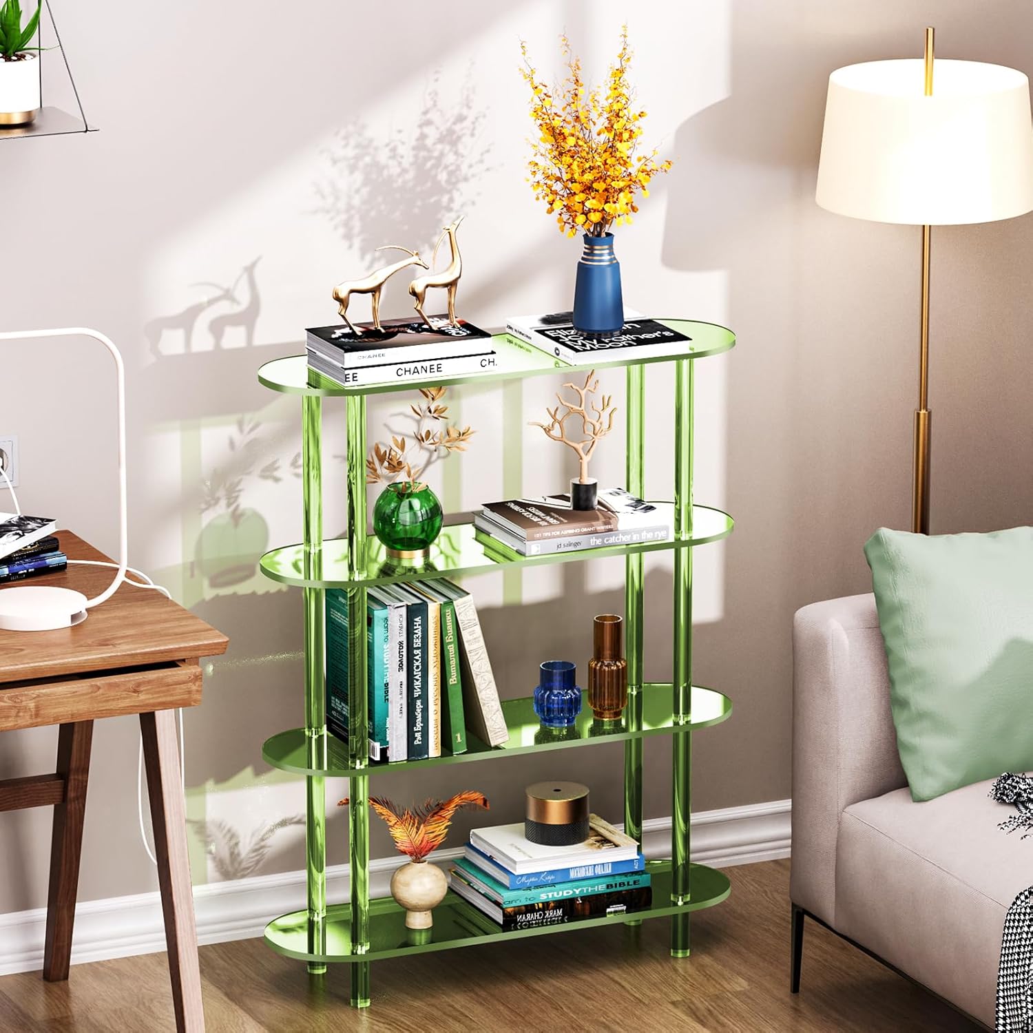 Clear Bookshelf, Acrylic Bookcase with Open Book Shelf Console Table for Entryway Office (4 Tier Green)