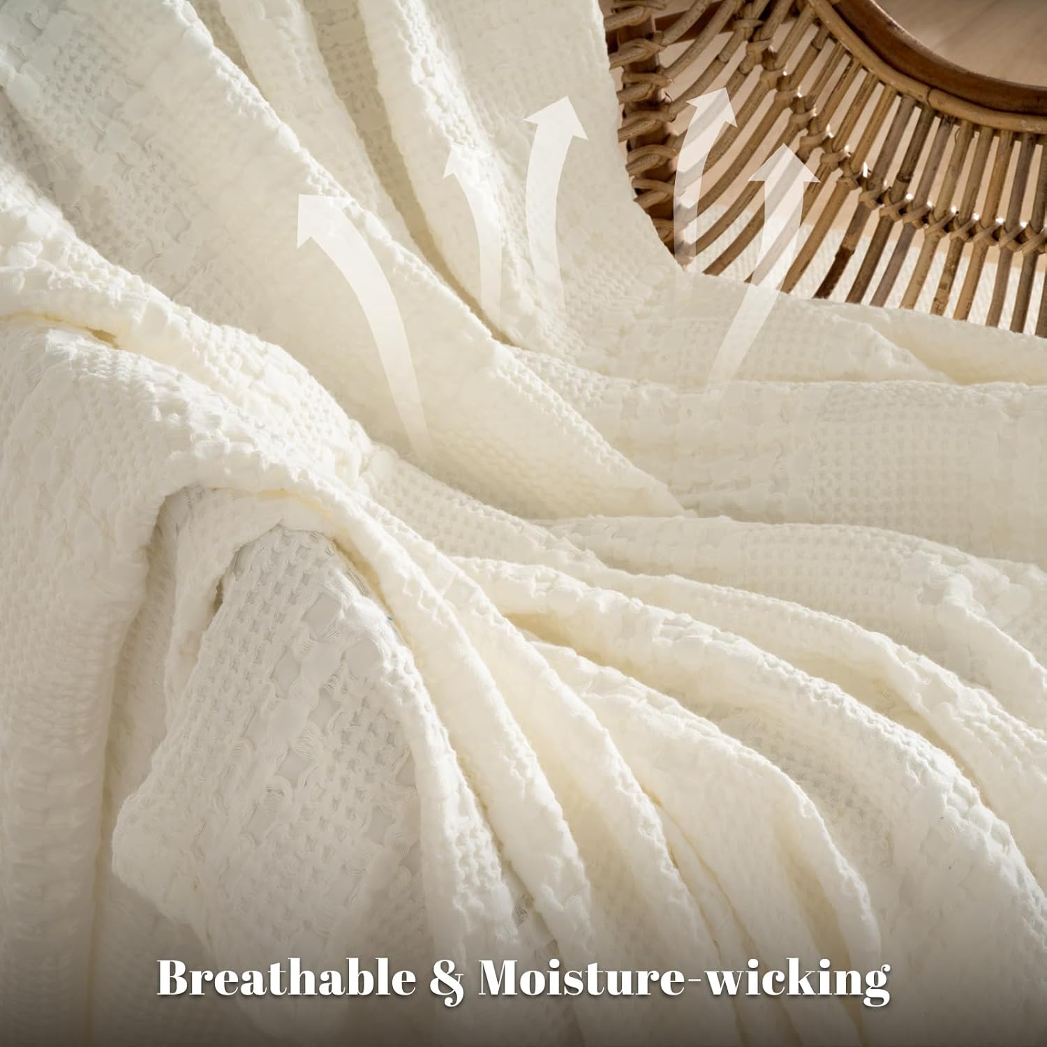 PHF 100% Cotton Waffle Weave Throw Blanket, Soft Lightweight Breathable Cozy Summer Throws for Couch Bed Sofa, Luxury Aesthetic Woven Blanket for Home Decor & Office, 50"x60", Ivory