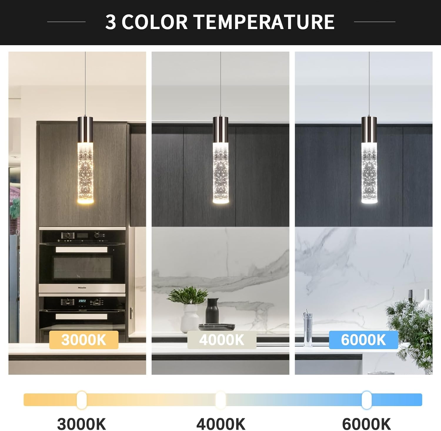 - [Adjustable 3cct Pendant Lights]: Pendant Light Fixtures color temperature can be adjusted 3000K 4000K, and 6000K.You can also use the control button to quickly switch the light color (cool white light, neutral light, and warm white light).
