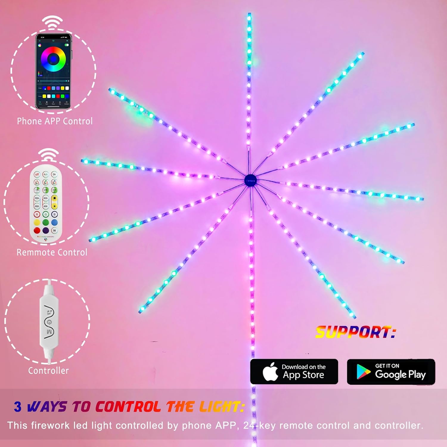 - đMulti-Function Smart Fireworks Lights: Upgraded firework led lights has 16 million colors, 213 dynamic color changing effects, music sync, timer, DIY the color and brightness adjustable etc functions. This LED strip lights can create firework launch effect for decoration.