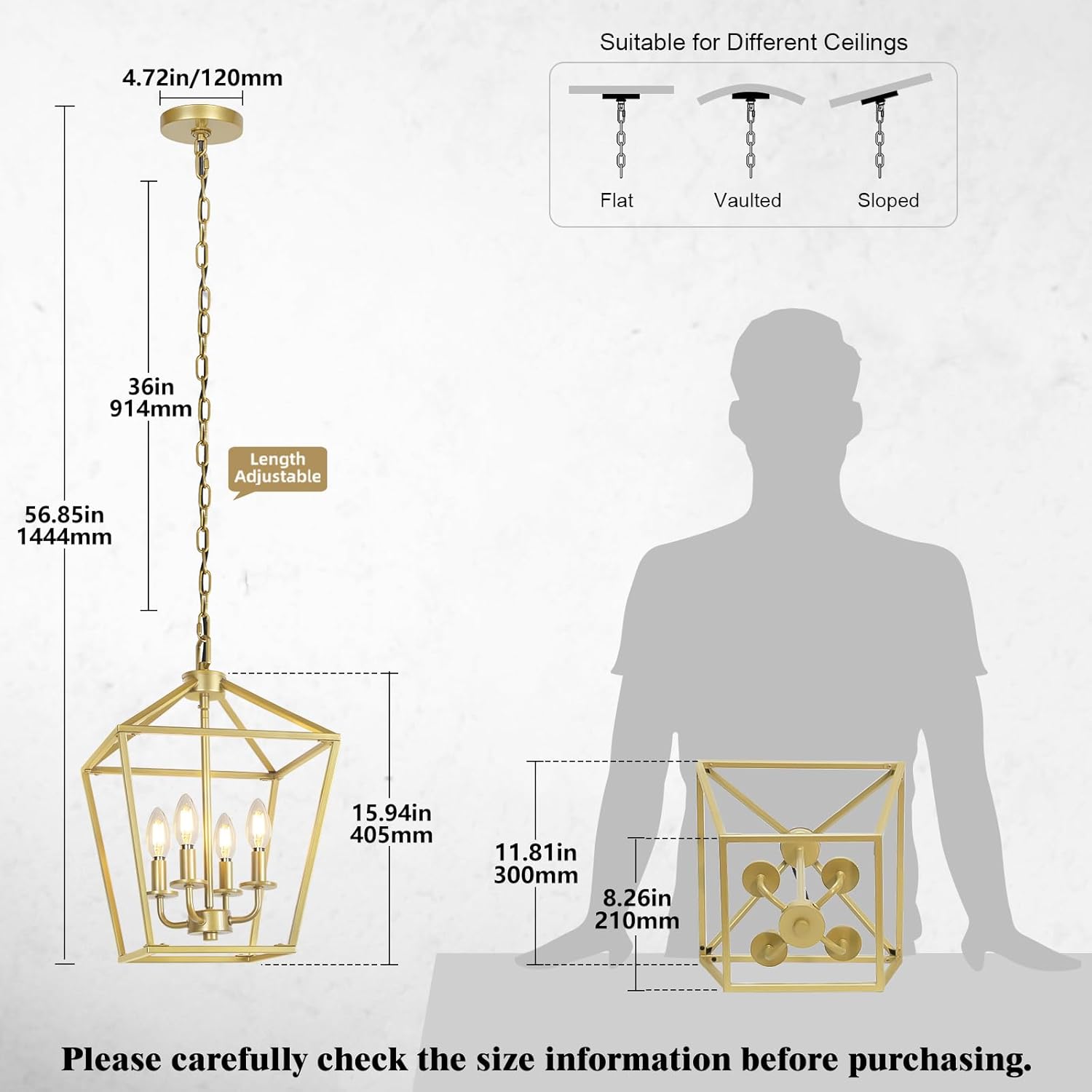 - Size & Assembly Required: The dimensions of this fixture are 11.8" top x 8.3" bottom x 15.9" high. Please carefully check the size information in the second picture before purchasing. This 4 light ceiling light fixture hanging height is adjustable, you can adjust the hanging height to your needs from 15.9'' - 56.9'' with removable buckle. Easy installation with plenty of fun, it's a great choice for you to finish this do-it-yourself project with your family and friend.